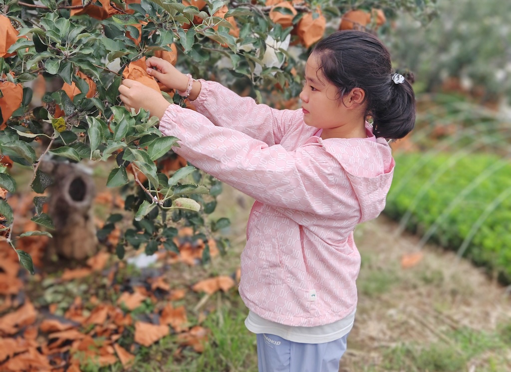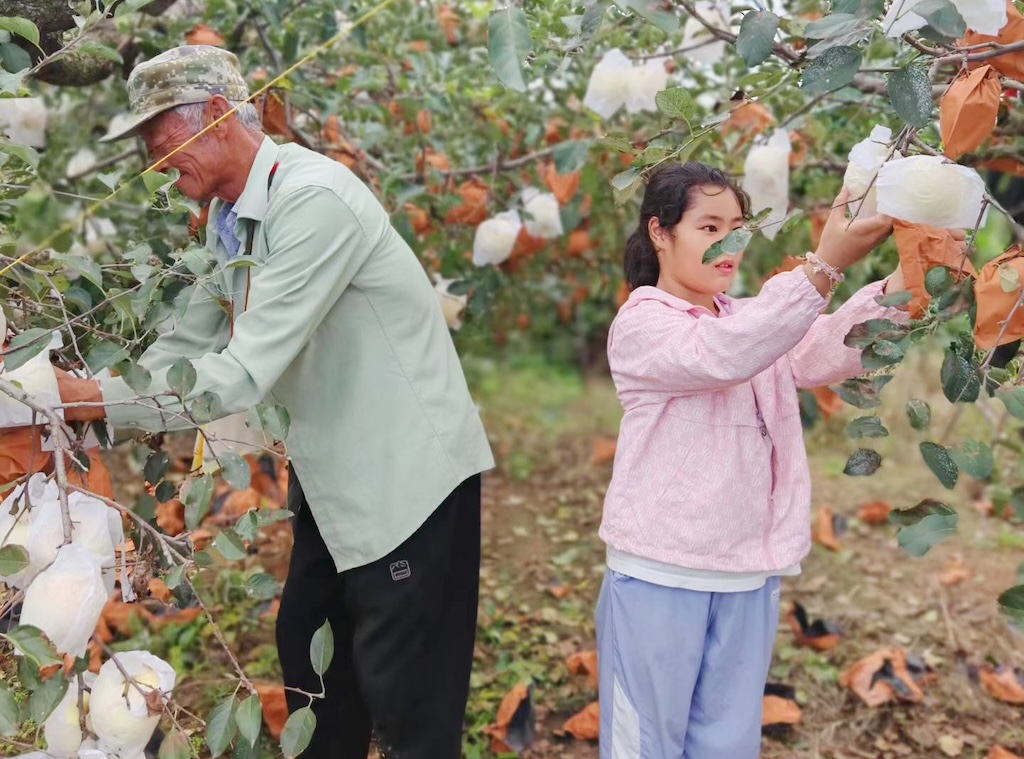 与此同时,有的学生利用节假日,来到自家果园,和家长一起采摘,谱就秋日丰收乐章。