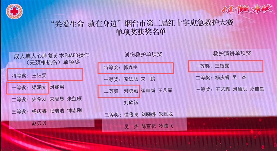 近日,由烟台市红十字会、烟台市卫生健康委员会、烟台市应急管理局联合主办的第二届红十字应急救护大赛圆满落幕。烟台幼儿师范高等专科学校公共服务系学子共斩获六项奖项:在成人单人心肺复苏术和AED操作单项赛中,24健康管理2班王钰雯获特等奖、25智康2班梁涵文获一等奖;在救护演讲单项赛中,24健康管理2班王钰雯获一等奖;在创伤包扎单项赛中,25智康5班郭鑫宇获特等奖、25智康5班刘晓燕获二等奖。由吕文禛、王钰雯、刘晓燕、梁涵文、郭鑫宇六名同学组成的参赛团队获团队二等奖(第二名)。