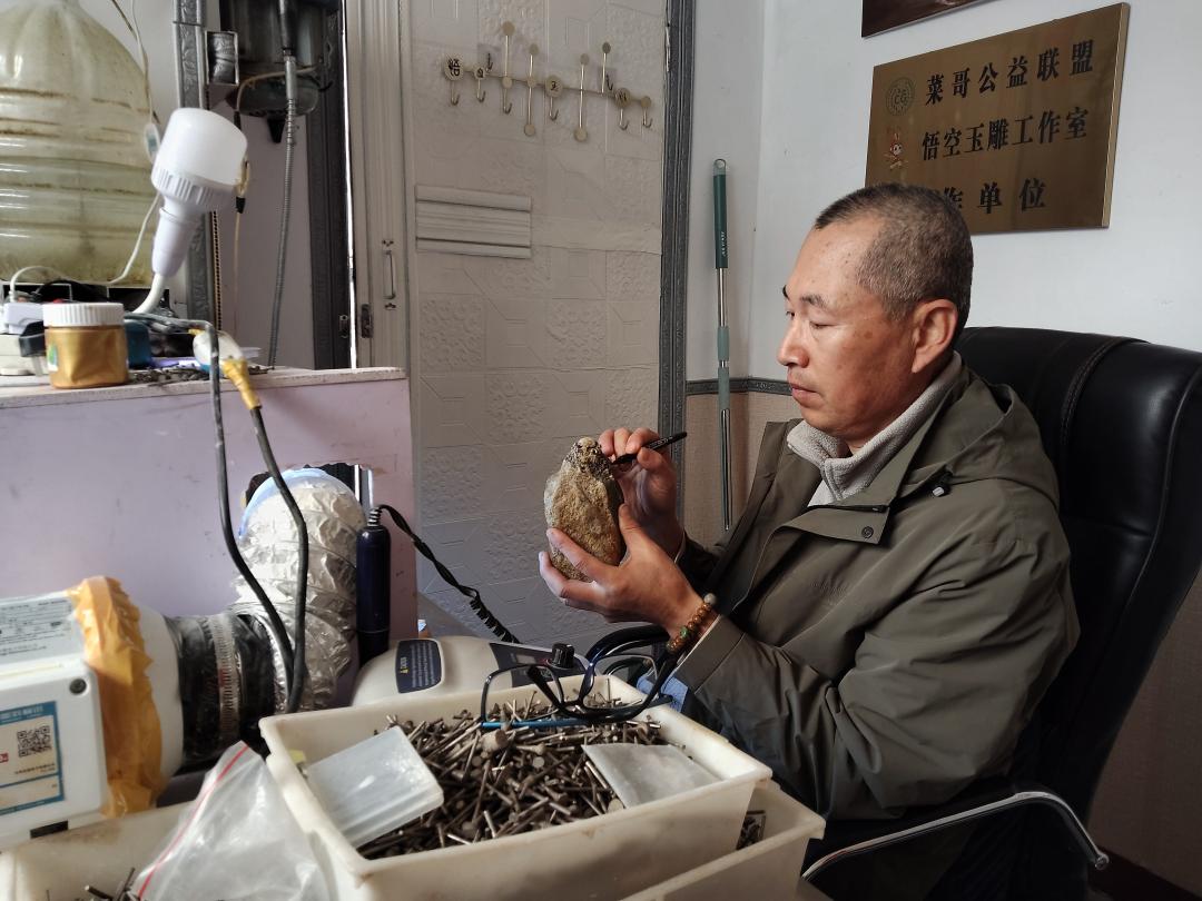在梨乡莱阳,有一位与玉石朝夕相伴的匠人,他叫宫健。今年52岁的他是莱阳市美术协会理事,还是一位在当地颇有名气的玉石雕刻师。他常自谦为“一块石头的搬运工”,凭借一双巧手,将冰冷坚硬的玉石雕琢成有温度、有灵魂的艺术作品。他作为莱阳市菜哥公益联盟的副队长,以一颗真挚的公益之心,为家乡的发展默默奉献,传递社会大家庭的温暖。