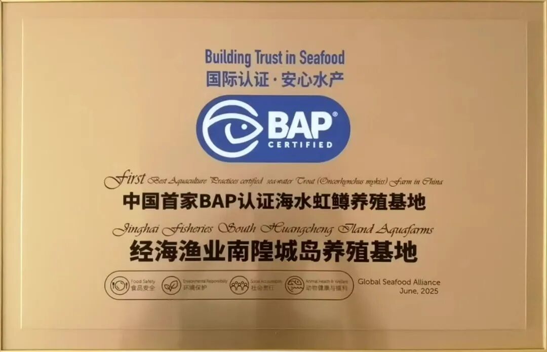 不仅如此,该公司“经海系列”网箱配备环境监测、智能投喂、大数据平台等系统,已取得国内首批网箱平台CCS入级证书。2025年6月,公司深远海虹鳟养殖基地通过BAP审核,成为中国首家BAP认证海水虹鳟养殖基地,填补了国内鲑鳟类深远海养殖认证空白。