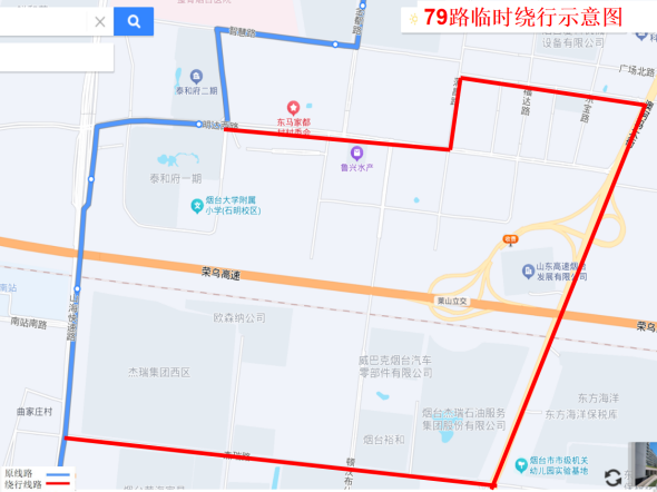 临时接相关部门通知,受南站站改及周边配套工程施工影响,山海路(明达西路南320米至杰瑞路北口)南北方向、烟台南站南路(规划南站西路一一山海路)东西方向中断交通,11月4日起,79路、86路、67路区间临时绕行,方案如下: