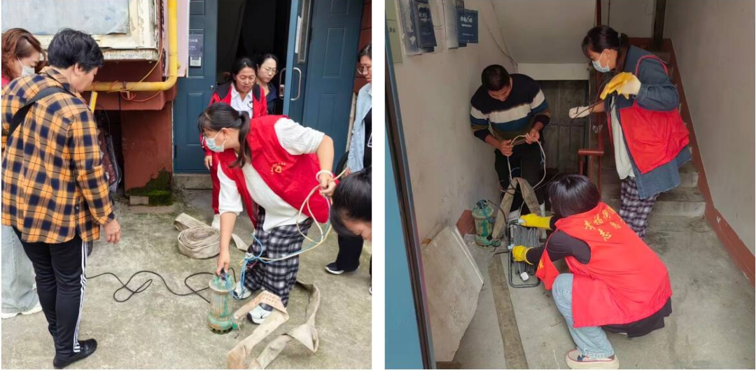 幸芝里社区党委与九隆合嘉物业携手开展了小棚排水志愿服务活动,党员志愿者们化身为“排险勇士”,与物业人员默契配合,形成了强大的攻坚合力。物业“智囊团”凭借对辖区情况的熟悉,迅速锁定漏水点与积水重灾区,党员志愿者则架起抽水设备,让积水迅速排出。