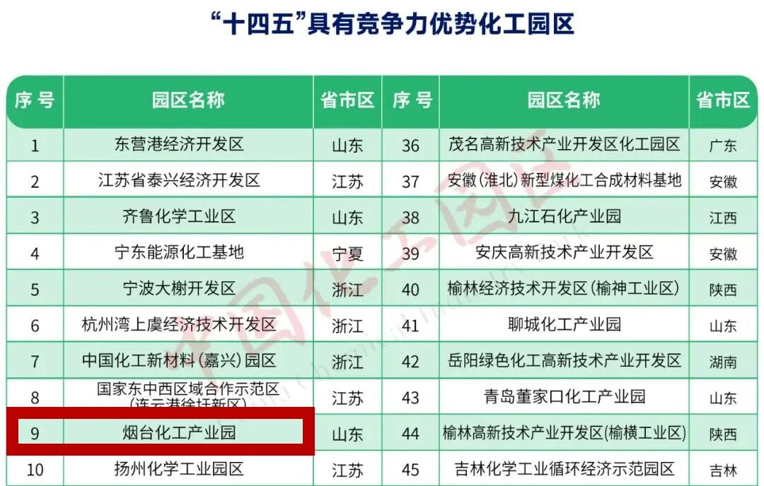 烟台黄渤海新区化工领域传来喜讯——近日,在浙江嘉兴召开的“2025中国化工园区发展大会”上,中国化工经济技术发展中心发布《“十四五”中国化工园区竞争力研究报告》,评选出4家竞争力卓越园区及70家具有竞争力优势化工园区,烟台化工产业园成功跻身全国具有竞争力优势化工园区十强榜单,位列第九。此外,该园区还获评“十四五中国智慧化工园区”称号,一举实现重量级荣誉双收获。