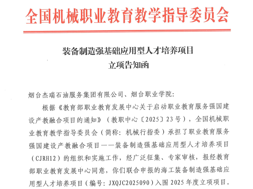 近日,全国机械职业教育教学指导委员会发布“装备制造强基础应用型人才培养项目立项告知函”,烟台职业学院与烟台杰瑞石油服务集团有限公司联合申报的“海工装备制造强基础应用型人才培养项目”获批立项,成为首批入选的80个项目之一。