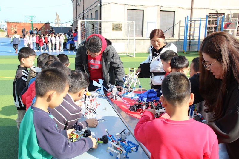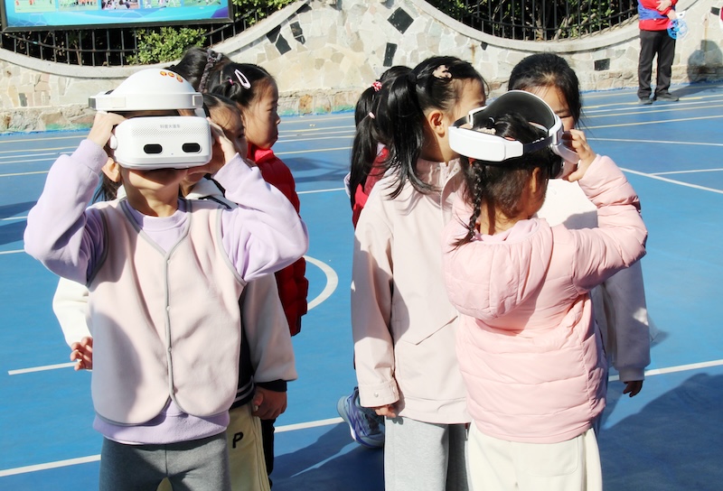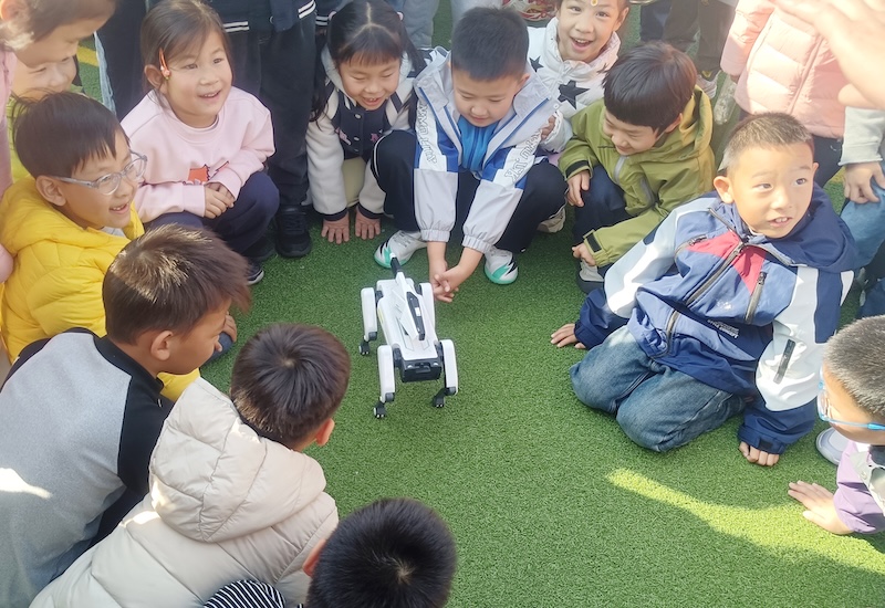 仪式结束后,来自芝罘区科协的志愿者们组织了“美育浸润行动”进校园科技展示活动,为学生们呈现了一场别开生面的科技盛宴。校园内设置了航模体验、科技试验、木工制作、VR眼镜体验、机器狗互动、乒乓球机关炮挑战等多个趣味展区。在航模展区,同学们亲手操控模型飞机,感受飞行的乐趣;VR眼镜展区内,戴上设备的孩子们仿佛置身太空或深海,沉浸式体验让他们直呼“过瘾”;机器狗展区前,灵活翻滚、精准响应指令的机器狗吸引了大批学生驻足,大家争相与这个“科技伙伴”互动。这些展区让学生在动手体验中收获乐趣。