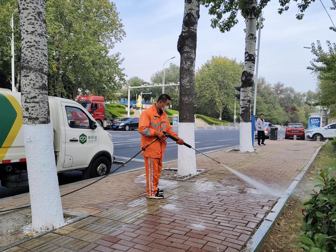 11月6日上午10时许,多辆高压清洗车已集结在大海阳路上,洒水车打头阵,伴随着高压水枪喷出强劲水流,路面上的泥沙和杂物都被冲到了两侧。作业人员驾驶大洗扫车,对路沿石底部、中央护栏根底等易藏污纳垢区域重点“攻坚”,原本附着灰尘的路面经水流冲刷后,露出干净的沥青本色。针对人行道板,小型清洗设备上阵清刷,保洁员手持高压水枪徒步作业,确保“无死角、全覆盖”。中环洁建投机械化班长刘健告诉记者:“我们是实行‘人工+机械’配合模式,人工负责精细化清刷,尤其是人行道板、路沿石底部等机械无法触及的区域。机械化依靠车辆组合循环作业,增加洗扫频次和力度,确保路面无浮尘。”
