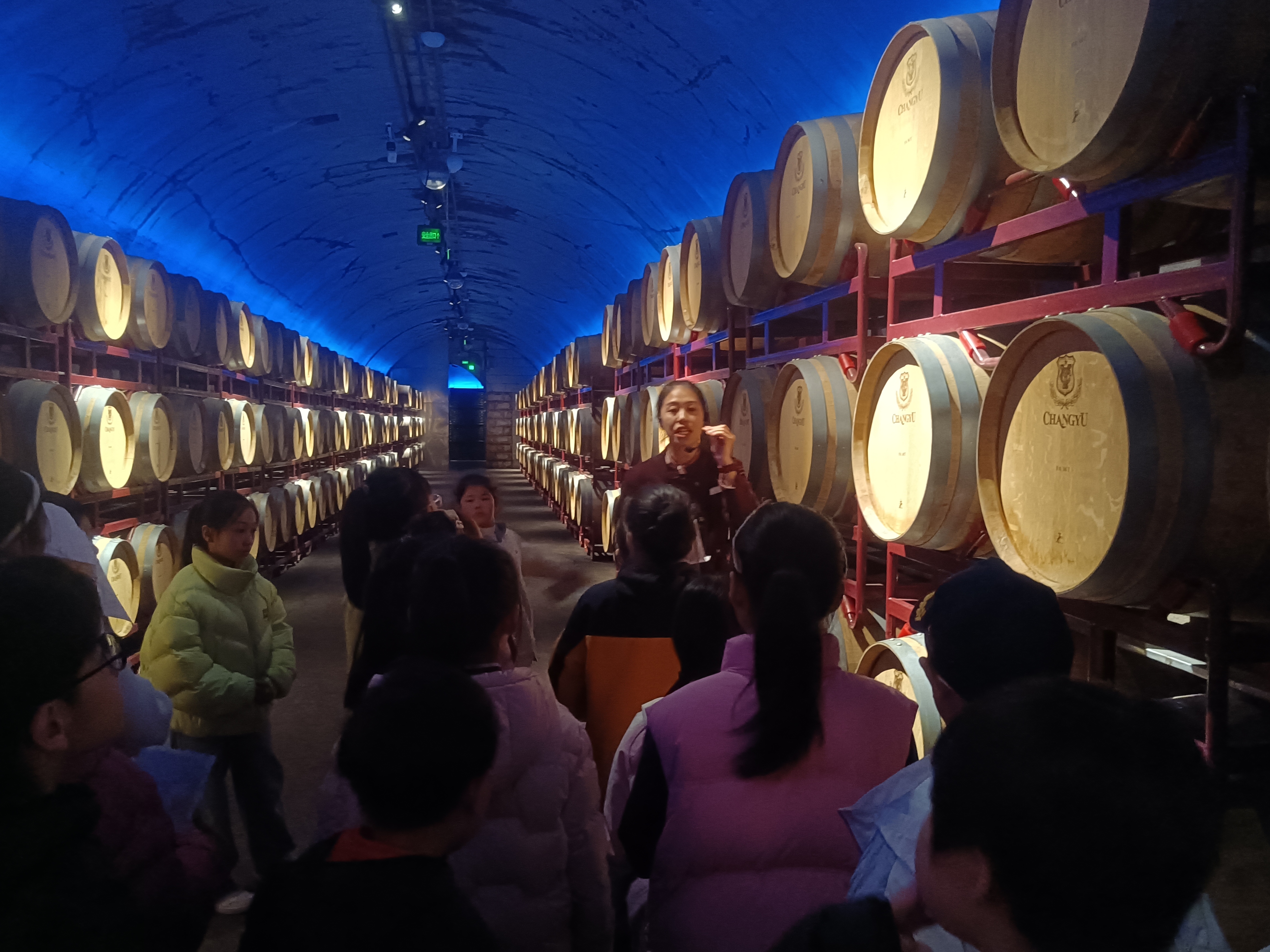 学生们在博物馆讲解员带领下走进百年张裕大酒窖,昏暗灯光中,木质酒架与橡木酒桶构成工业美学画卷。老师结合实物讲解拱顶建筑线条美、木材肌理之美,引导学生观察光影、触摸材质,沉浸式感受建筑与工艺之美。