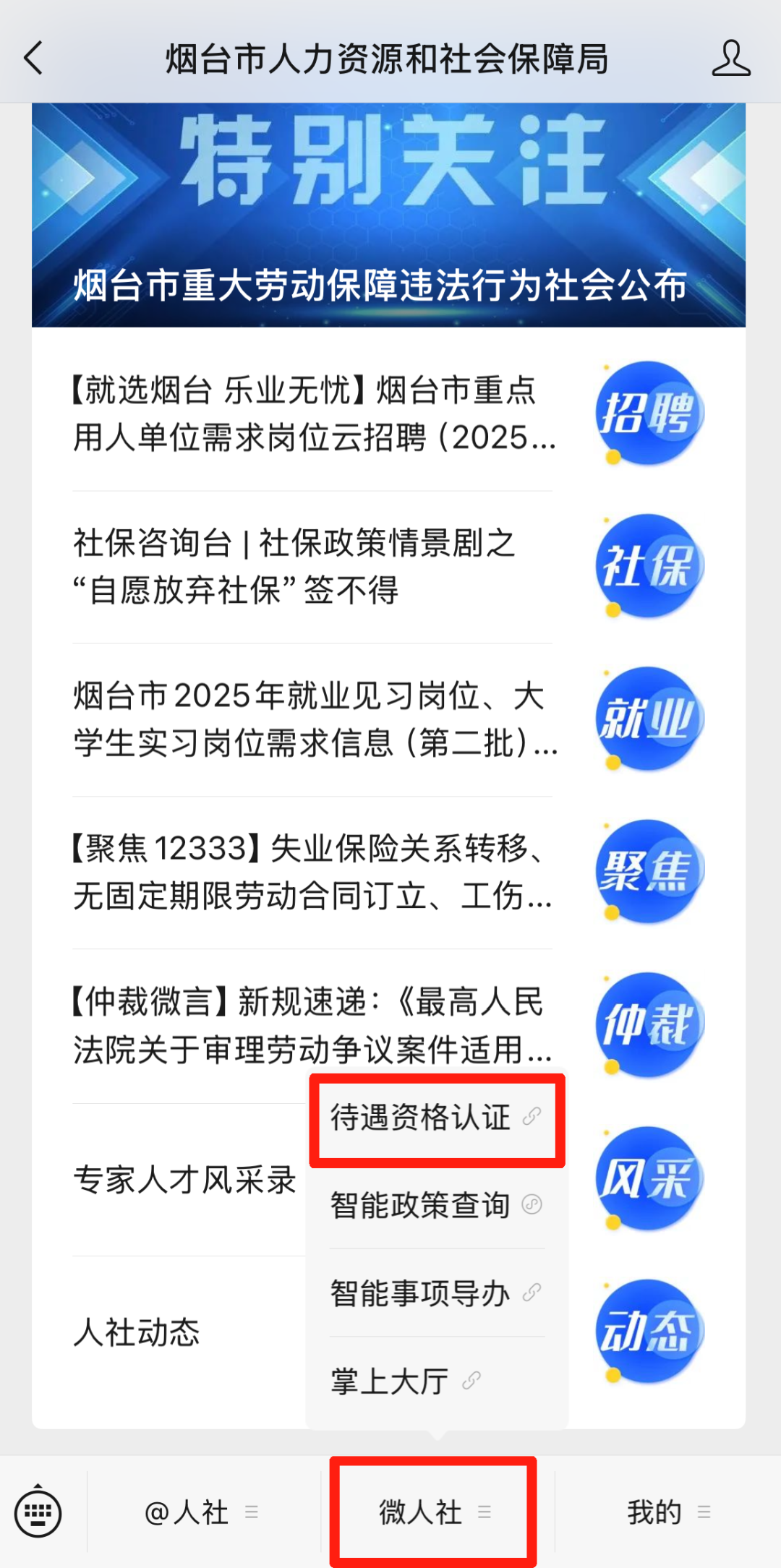 (1)关注烟台市人力资源和社会保障局微信公众号