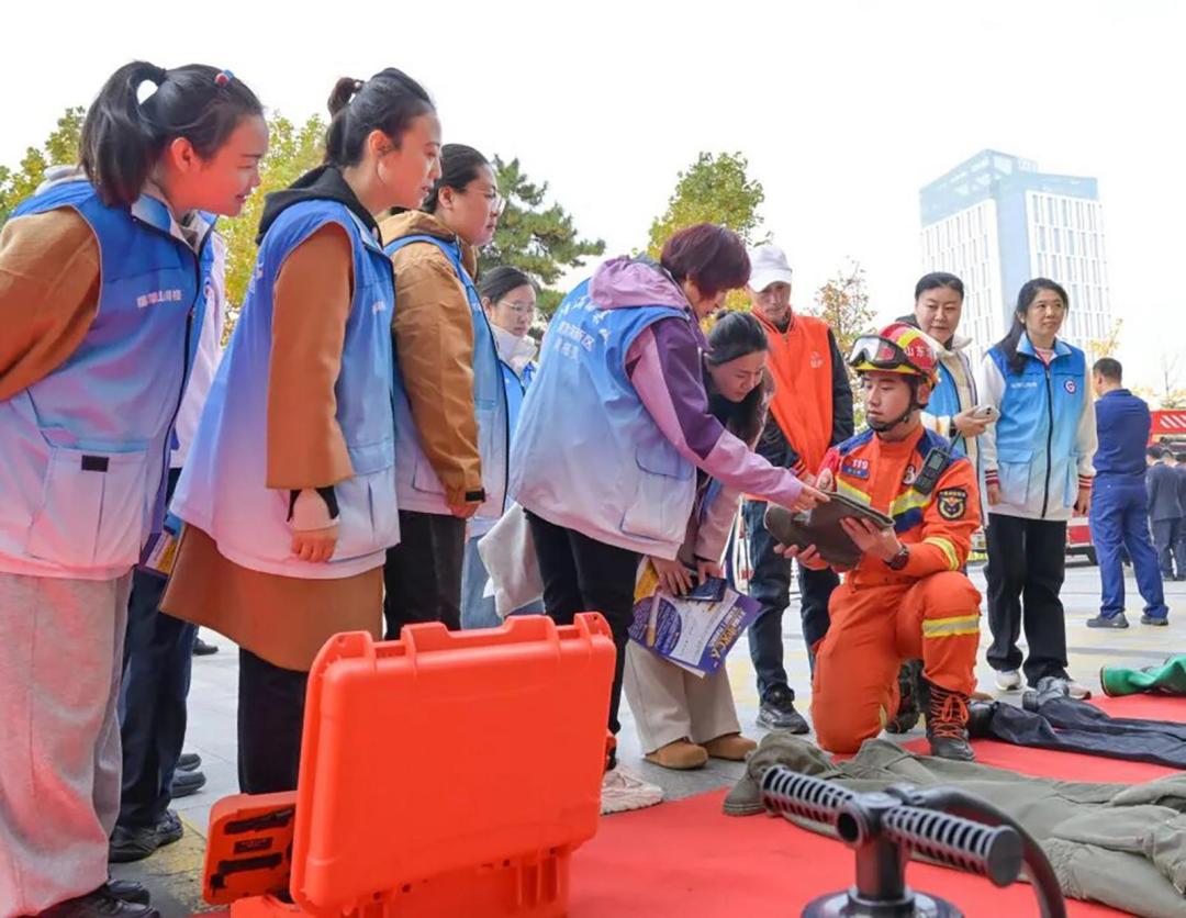 活动现场气氛热烈,消防员、社区工作者、消防志愿者和社会单位代表共计200余人共同参与,五大特色体验区联动开放。在消防车辆器材展示区,高层供水车、举高喷射车等“硬核装备”震撼亮相,让市民直观感受现代消防的科技力量;电动自行车防火咨询区,消防员通过实物对比和专业讲解,为市民答疑解惑;消防产品鉴别区以“干货+福利”的形式,让知识在趣味问答中深入人心。