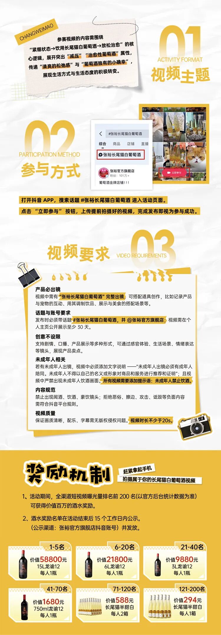 挑战内容: 发布抖音视频,展现你与长尾猫白葡萄酒的萌趣互动!突出“减压”“治愈性葡萄酒”属性,传递“清爽的松弛感”与“葡萄酒独有的小确幸”!