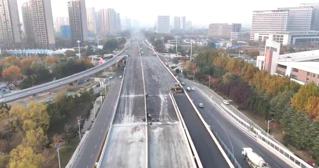 站在轸格庄立交观海路-学院路跨线桥上,地面上车辆川流不息,桥面上机械轰鸣,沥青道路在眼前铺展开来。