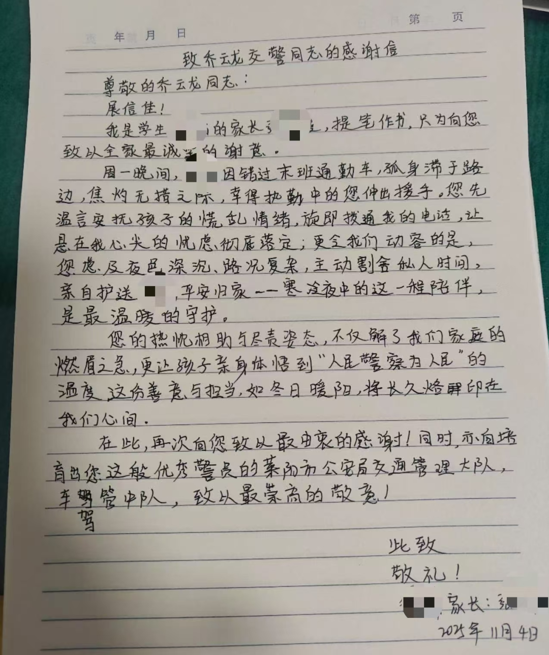 11月4日,男孩妈妈辗转打听到乔云龙的姓名和工作单位,亲手写下这封感谢信。信中的字句恳切而动人:“您的热忱相助与尽责姿态,不仅解了家庭的燃眉之急,更让孩子亲身体悟到:人民警察为人民的温度。”