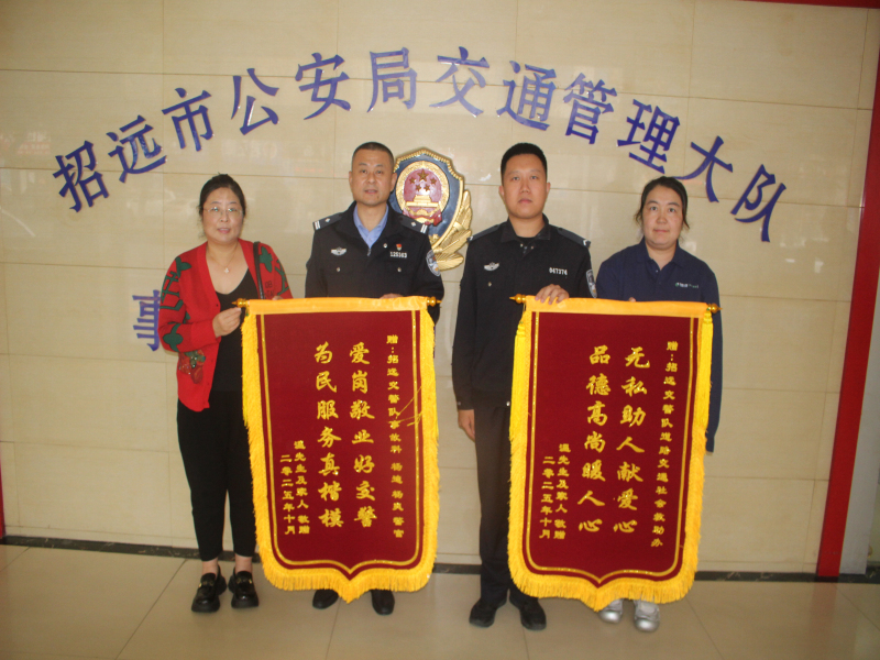 近日,市民温某的女儿专程来到招远大队,分别为事故预防和处理中队杨警官和救助办送上两面写有“爱岗敬业好交警,为民服务真楷模”,“无私助人献爱心,品德高尚暖人心”的锦旗。感谢交管大队工作人员认真负责的工作态度。