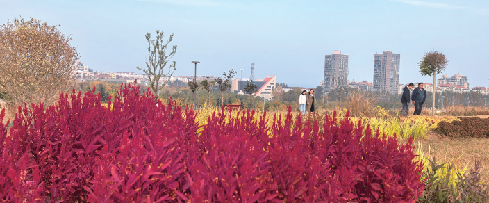 烟台融媒11月14日讯(记者 杨春娜 摄影报道)初冬时节,漫步于观海路人行步道,眼前铺展开一片无垠的绿色画卷。大片粉黛乱子草在微风中摇曳,呈现出如梦似幻的紫色云雾,沿山体分布的水塘波光粼粼,吸引了不少市民在此休闲游玩,这里就是观海路与竹林路山体修复工程。今年9月开放后,这片焕发新生的绿地成为市民和游客的热门打卡地。