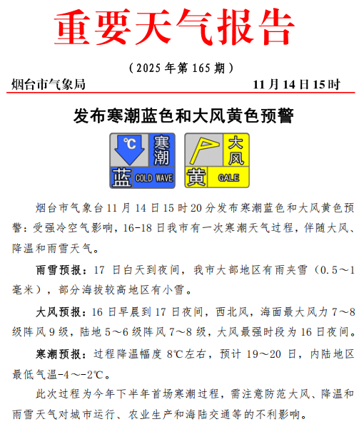 此次过程为今年下半年首场寒潮过程,需注意防范大风、降温和雨雪天气对城市运行、农业生产和海陆交通等的不利影响。