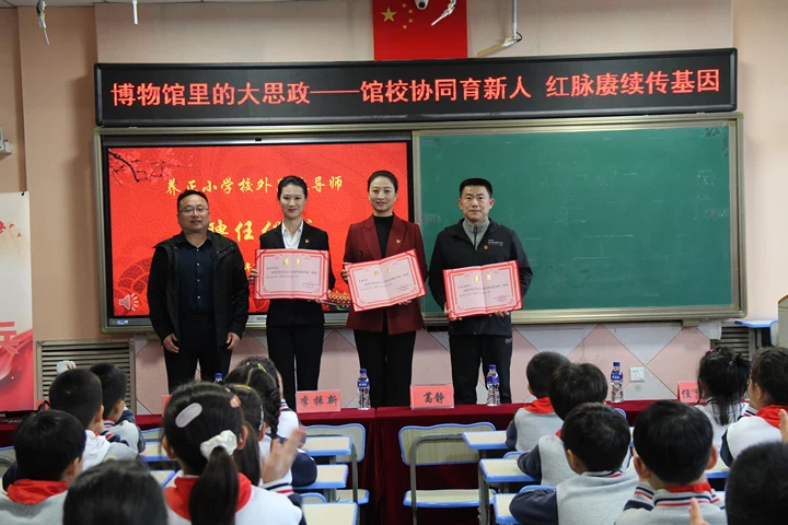 烟台融媒11月14日讯(YMG全媒体记者 赵蓓蓓 通讯员 刘艳波)近日,芝罘区养正小学联合烟台胶东革命纪念馆举办“博物馆里的大思政——馆校协同育新人 红脉庚续传基因”主题活动。李振新校长为葛静主任等三位老师颁发“校外思政导师”聘书,这份聘书既是校馆深化合作的纽带,也凝聚着传承胶东革命精神的决心,在场师生纷纷表示将主动汲取红色养分,让革命精神代代相传。