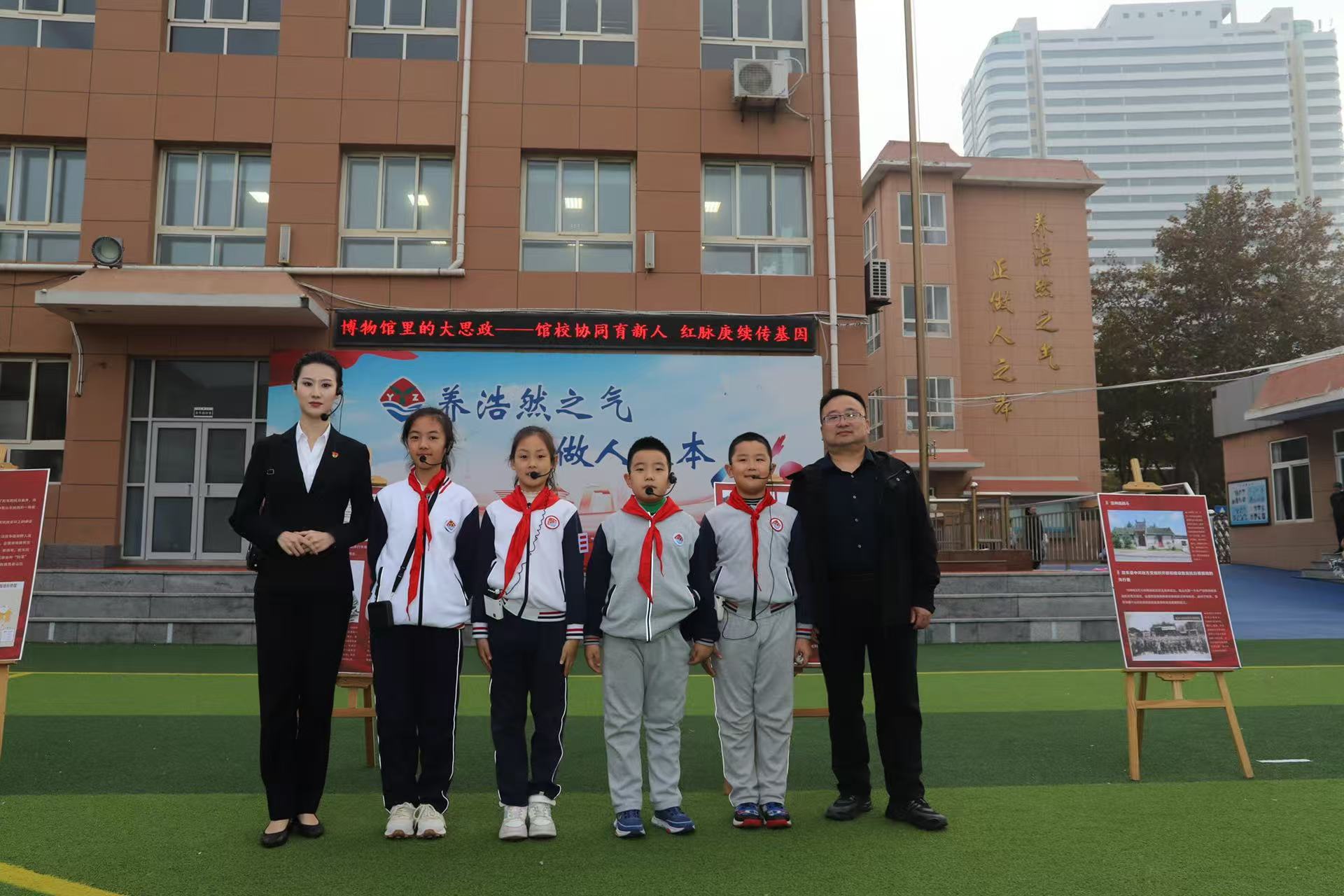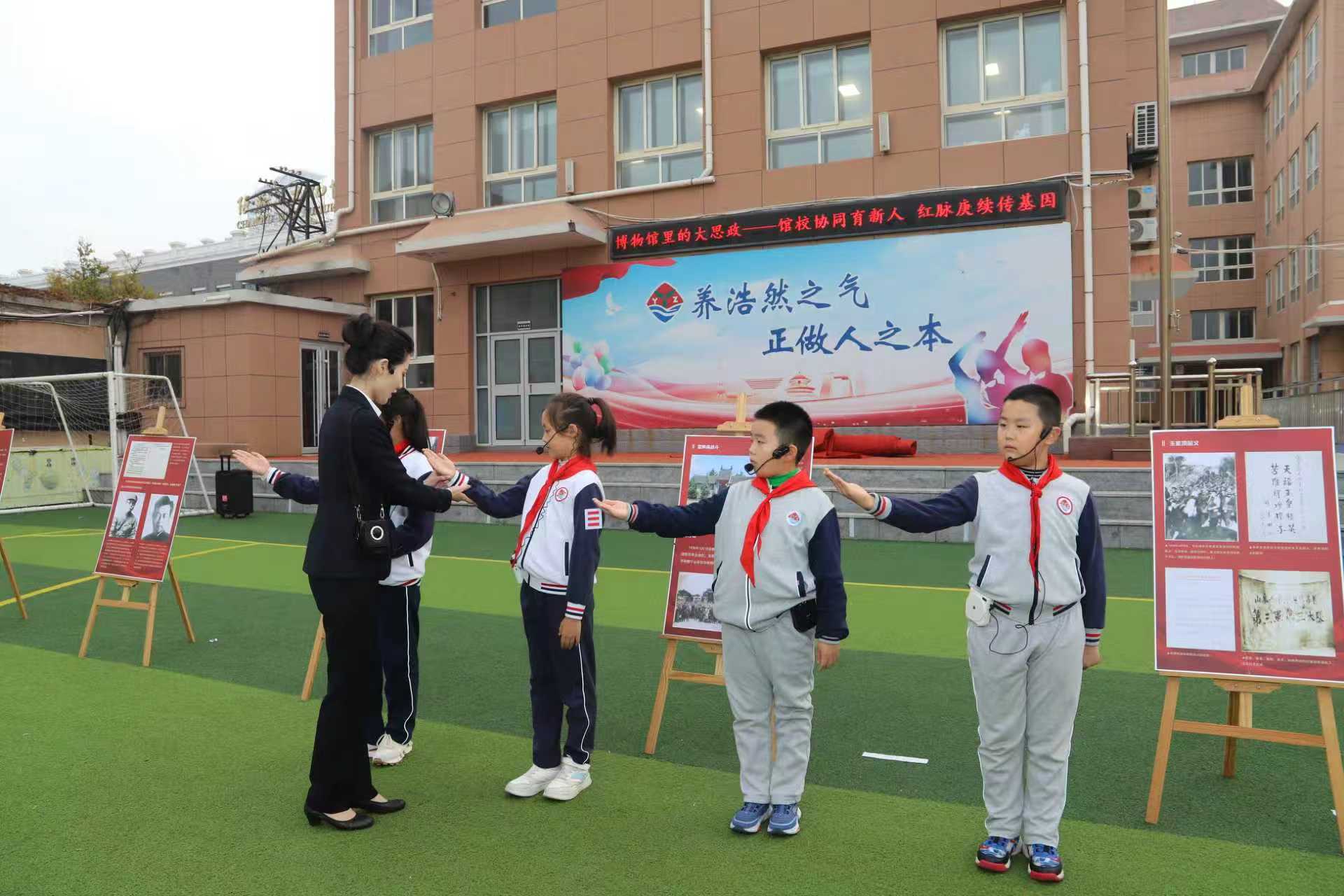 室外场地氛围热烈。张雅萍老师现场指导学校红领巾小解说员,同学们精神饱满、从容自信,结合图文并茂的展板,生动讲述胶东抗战的革命故事,带领大家重温峥嵘岁月,感受先辈深厚的家国情怀。
