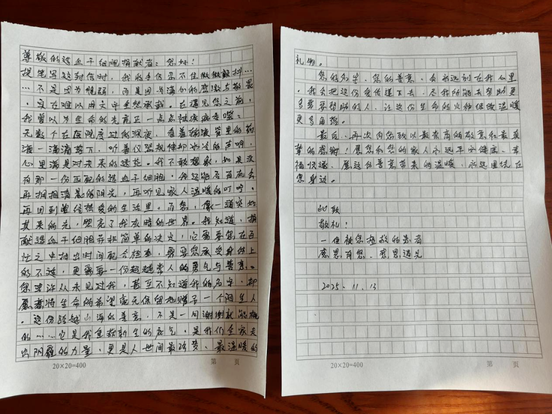 在捐献过程中,周晓丽收到了来自受捐患者的感谢信,信中这样写道:“您或许从未见过我,甚至不知道我的名字,却愿意将生命的希望毫无保留地赠予一个陌生人。这份跨越山海的善意,不是一句‘谢谢’就能概括的……它是我重获新生的底气,是我们全家走出阴霾的力量,更是人世间最珍贵、最温暖的礼物。”