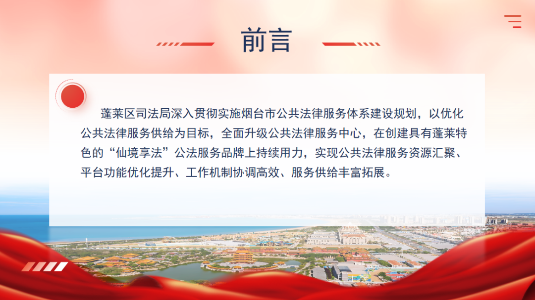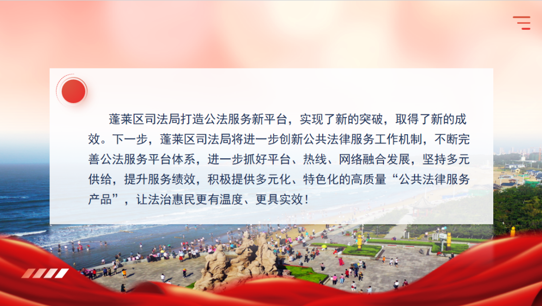 近年来,烟台市司法局紧紧围绕建设覆盖城乡、便捷高效、均等普惠的现代公共法律服务体系目标,始终将公共法律服务作为司法行政工作的重中之重,顺利完成“一年打好基础、两年巩固提升、三年创新突破”的阶段性目标。全市公共法律服务领域涌现出一批创新成果与典型经验,形成了“一域一品、百花齐放”的品牌矩阵。今天展播的是蓬莱区司法局《创优“仙境享法”品牌——打造综合性公共法律服务新平台》。