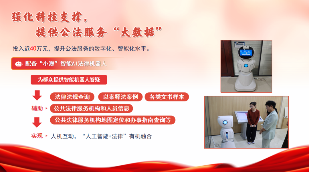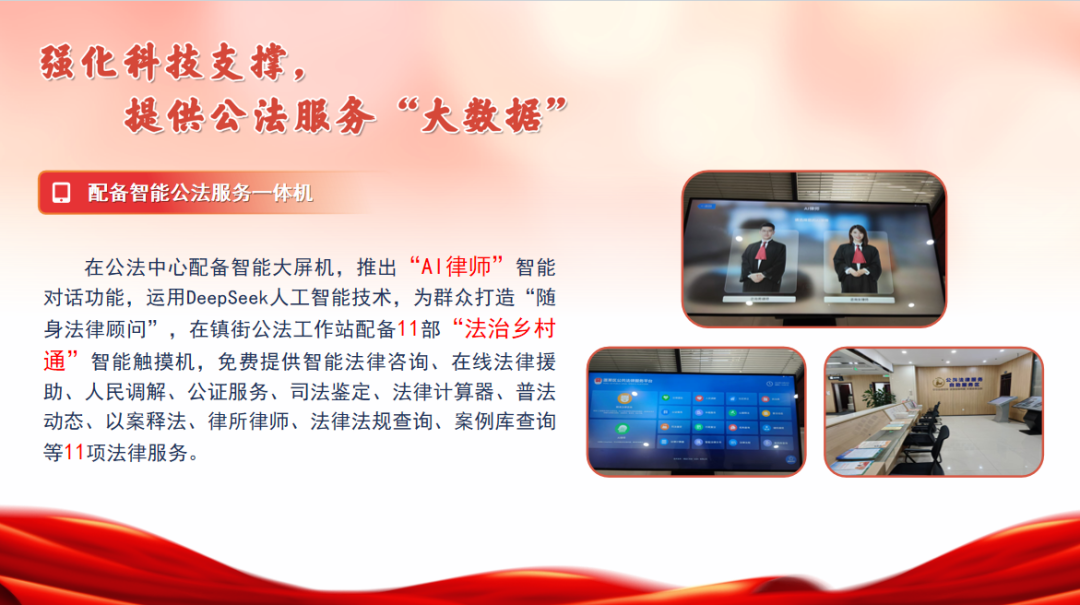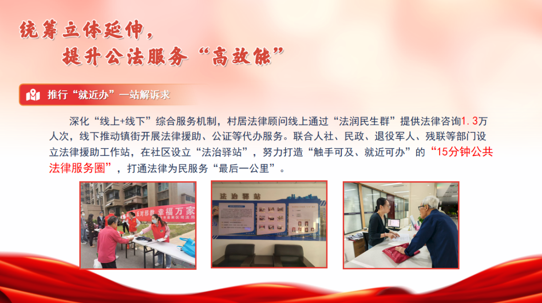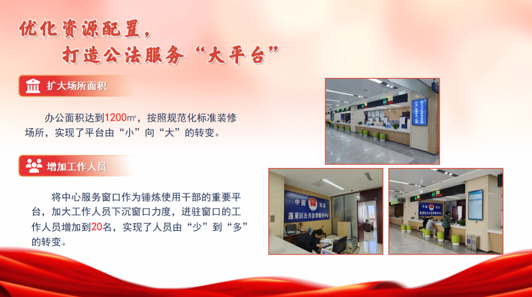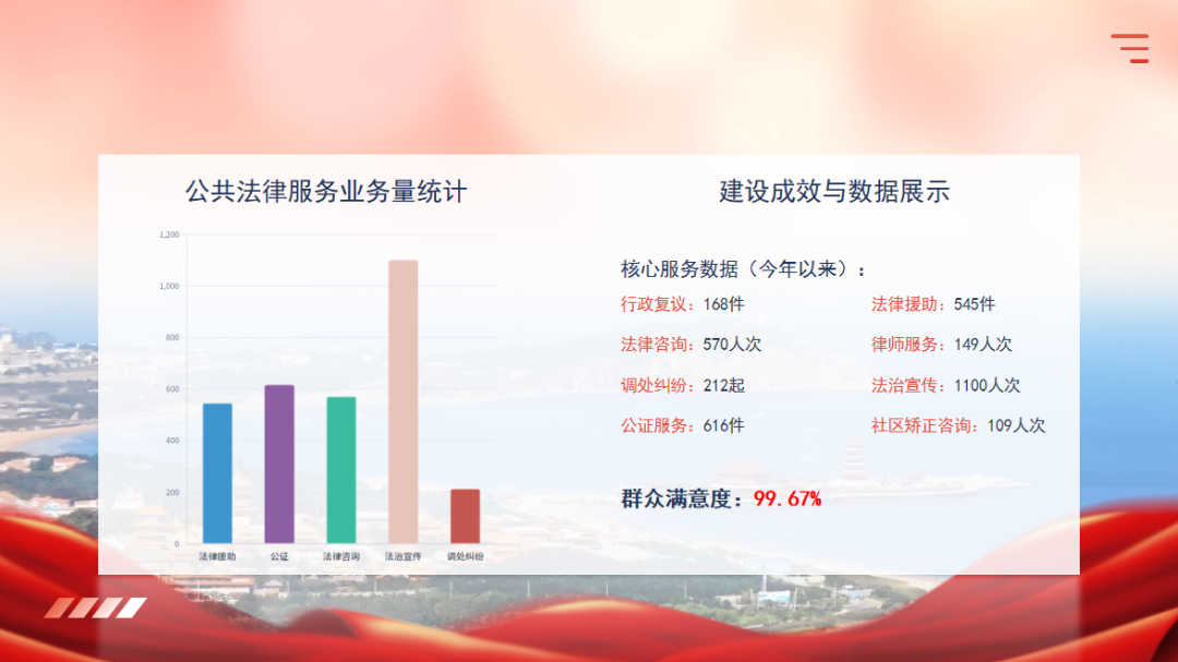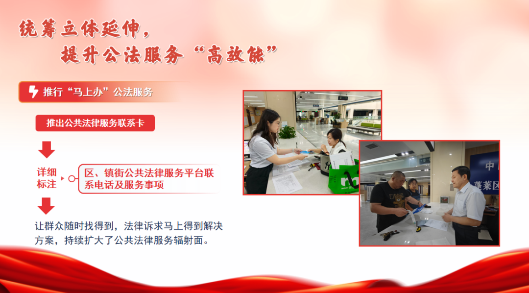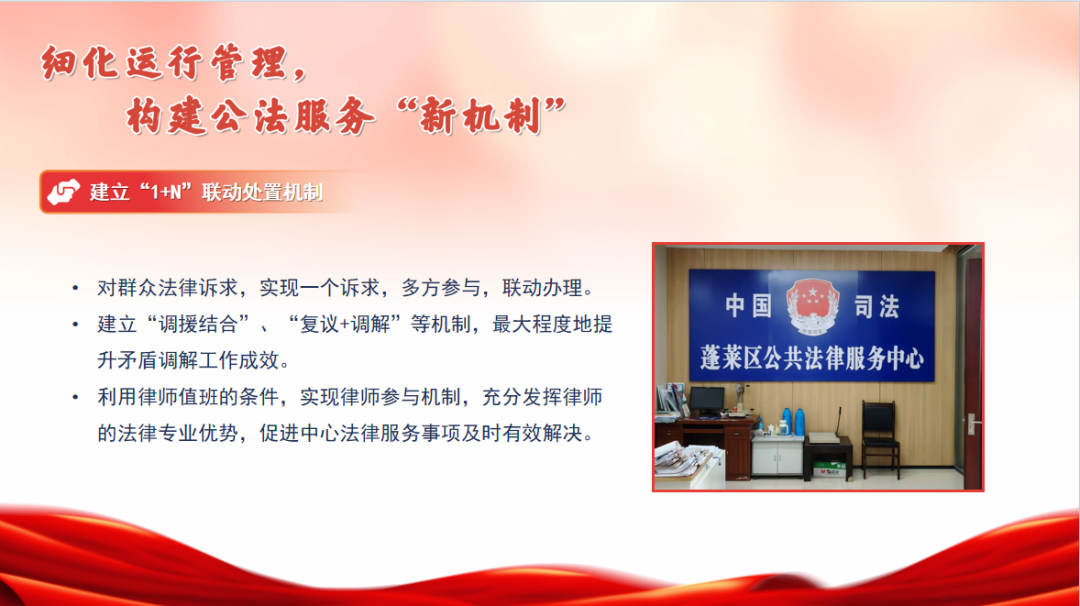 蓬莱区司法局深入贯彻实施烟台市公共法律服务体系建设规划,以优化服务供给、提升群众满意度为目标,对区公共法律服务中心进行全方位升级。中心聚力打造“仙境享法”特色品牌,持续推动法治资源集约化汇聚、平台智能化升级、机制协同化运行。通过拓展服务领域、创新服务模式,有效丰富了公共法律服务供给,切实增强了群众的法治获得感与满意度,形成了具有蓬莱辨识度的公共法律服务新格局。