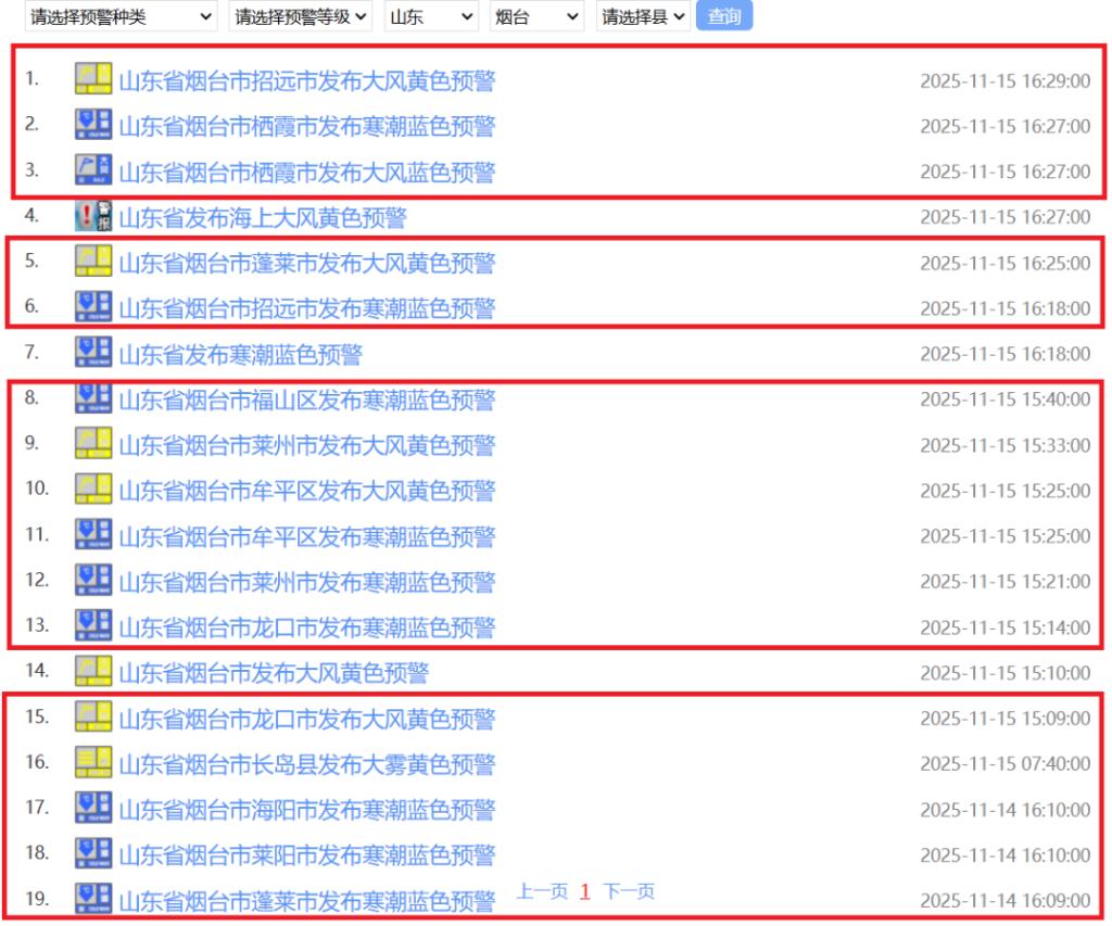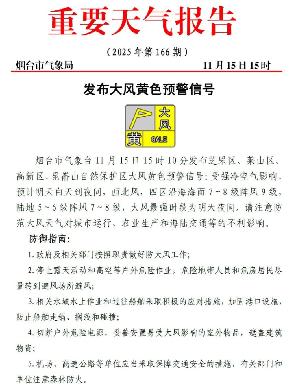 受强冷空气影响,16-18日烟台市有一次寒潮天气过程。预计16-17日,西北风,海面最大风力7~8级阵风9级,陆地5~6级阵风7~8级,大风最强时段为16日夜间。过程降温幅度8°C左右,19~20日内陆地区最低气温-4~-2°C。请注意防范。