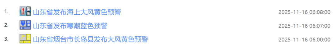 山东省气象台于11月16日06时00分继续发布寒潮蓝色预警:受强冷空气影响,16—18日我省将出现寒潮天气,气温明显下降,全省大部地区最低气温过程降温幅度10℃左右,局部地区可达12℃。最低气温出现在18日早晨,鲁西北和鲁中山区-6~-4℃,沿海地区1~4℃,其他地区-4~-2℃。16—17日,北风,滨州、东营、潍坊、日照、半岛地区和内陆湖面5~6级阵风7~9级减弱到4~5级阵风6~7级,其他地区4~5级阵风7~8级减弱到3~4级。