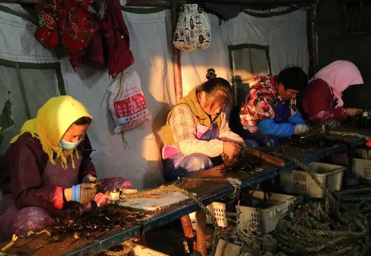 “时间不等人,这个季节就是夹苗的季节。我们村里每个妇女都出来夹苗,俺家养了4000来绳,每年能产海带7、8万斤。”东村养殖户赵传伟边发苗边说,话里流露出与时间赛跑的忙碌。