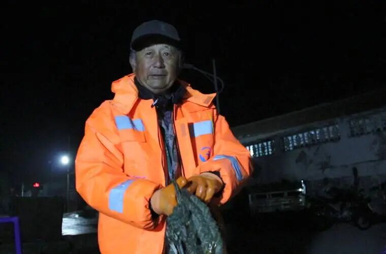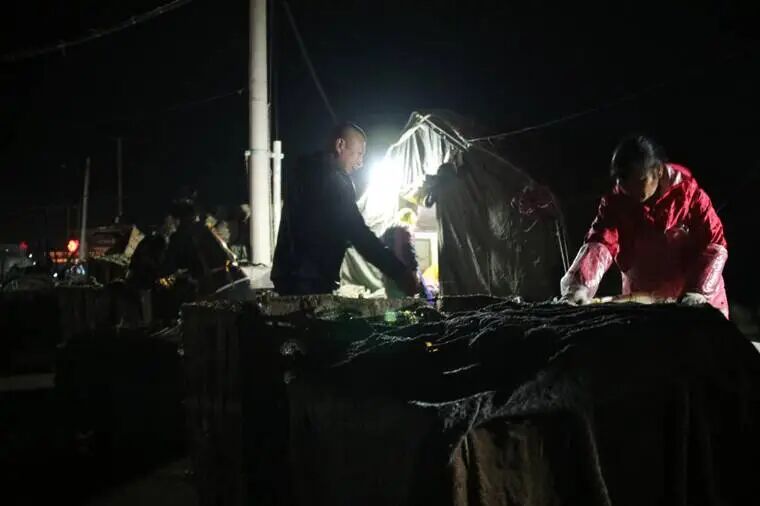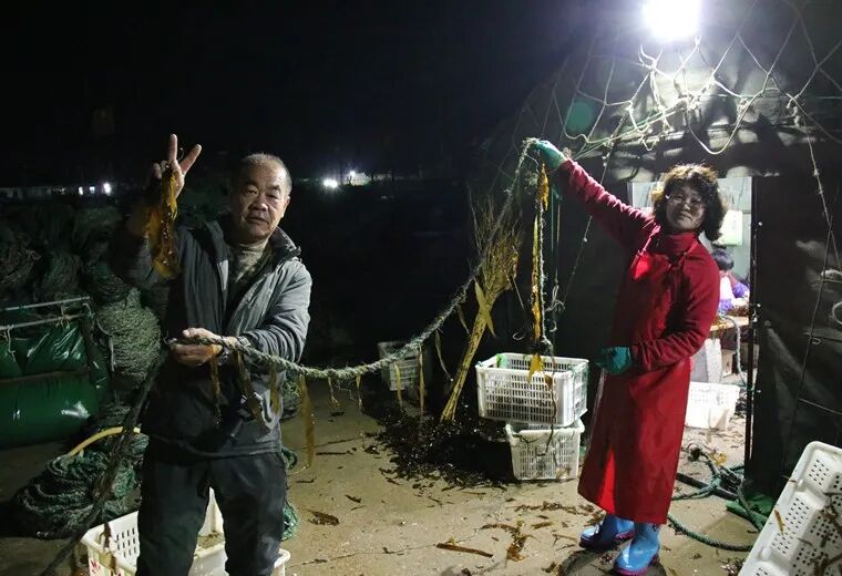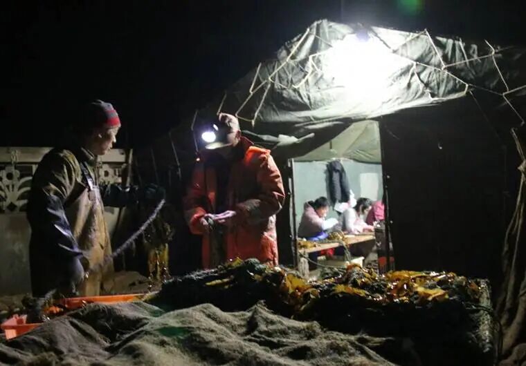 凌晨两三点钟,天色黢黑黑一片,大钦岛乡的各个渔港码头却是灯火通明,一派繁忙。“3号6个,50加6,56个”一顶顶军绿小帐篷、养殖场内传来阵阵记件声。灯光下,渔家大妈大嫂们身着各色棉袄、鲜艳头巾和高筒雨鞋的标配“战衣”,排排坐在夹苗器前,一拉、一拧、一夹,熟练地“穿针引线”,将二三十公分的海带苗均匀地“夹”进苗绳的缝隙中。“我们每天早晨两三点钟过来,夹到下午3点来钟,一天能夹个一百五六十根。”有三四十年夹苗经验的北村渔嫂田玉双手法娴熟,边干边聊,手中的活计一点不耽误。