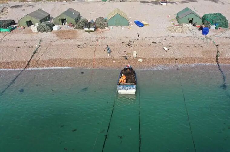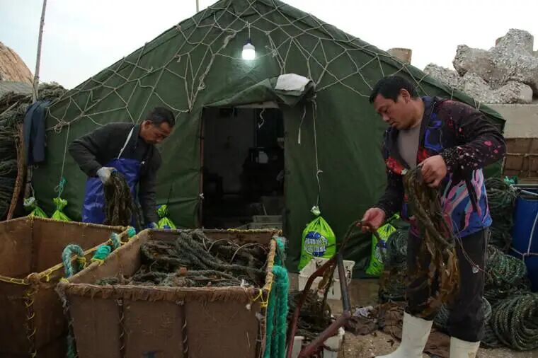 与内陆的春播夏植不同,在长岛,每年的11月是海带的“播种”期。为了抢抓晴好天气让海带苗走出育苗小天地,投入大海的广阔天地历练成长,渔哥渔嫂们与节气抢时、与海浪共舞,用寒风中的辛勤劳动播种来年海带丰收的希望。军绿帐篷和养殖场内外,他们身穿防水围裙或水衣水裤,脚着长筒水鞋,井然有序地开始自己的工作:有的负责从海上采收、运回暂养的海带幼苗;有的负责用海水浸泡夹苗用的尼龙绳;有的负责检查夹苗质量和搬筐吊装;而渔嫂们则发挥心细手巧的优势,专司夹苗。一系列工序在机械和人工配合下环环相扣,流水不滞。