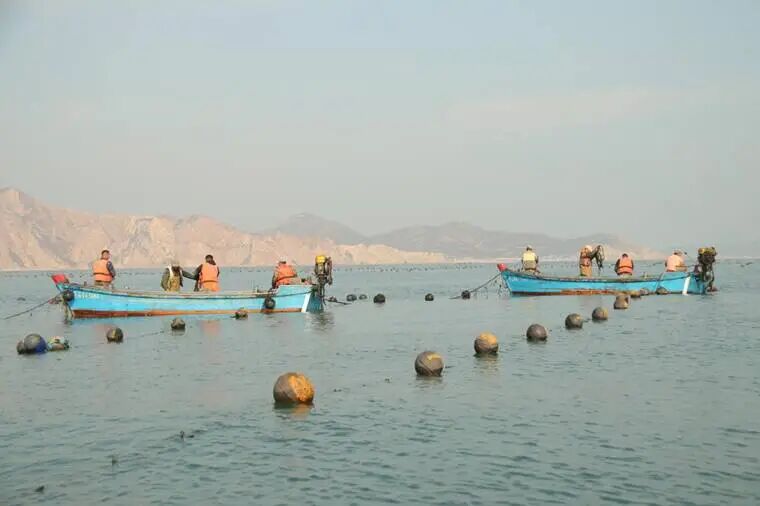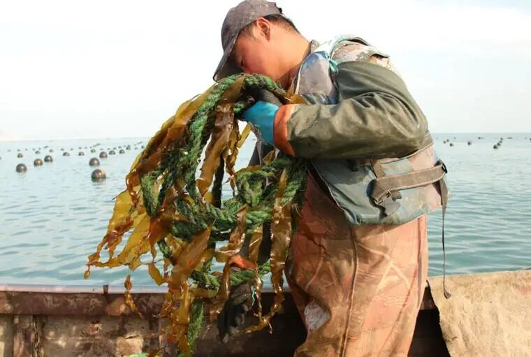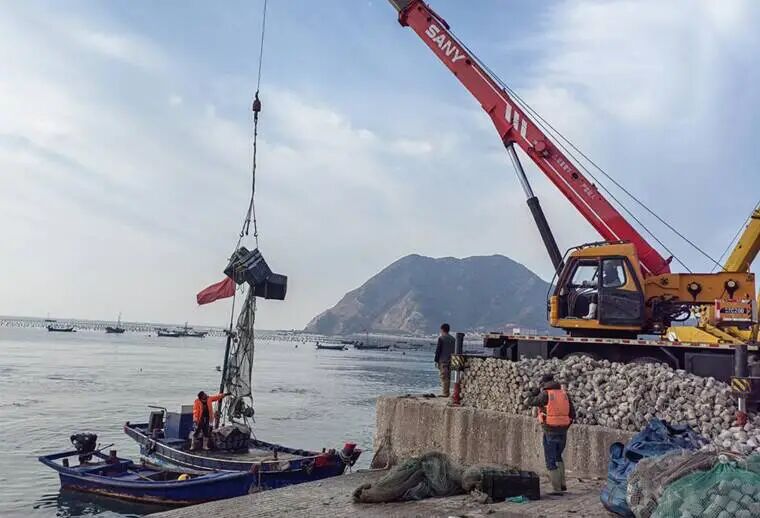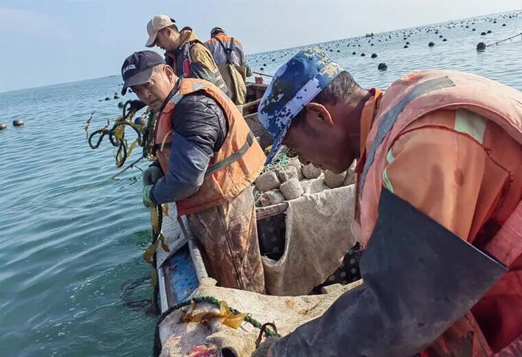 与此同时,在蔚蓝的大海上,与海带夹苗相关的环节也在有条不紊地进行着。养殖工人大多是从业多年的“老手”,经验丰富,配合默契,吊装、递送、系坠、挂苗、抛绳……海带苗从“集体宿舍”被搬进“宽敞别墅”,沉睡的海田在渔民们的精耕细作下焕发新的生机。过不了多久,播种下的苗种将变成一片郁郁葱葱的海中森林。
