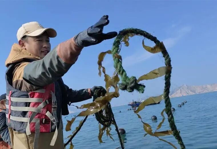 “今年选种的‘宽菜’品种,海带特点是叶宽、片厚、带体长。这么冷的天夹苗非常辛苦,对于靠海吃饭的人来说,冬天就是我们的抢种季,为2026年海带丰产丰收打下一个坚实的基础。”小浩村养殖二场的唐道帅熟练地与养殖船上其他三位养殖工人打着配合,保证每一根苗都挂得结实到位。这些长在绳子上的小嫩苗在未来几个月的时间里,要在冰冷的海水里经风历浪,锤炼体格,慢慢长成肥壮的大海带。
