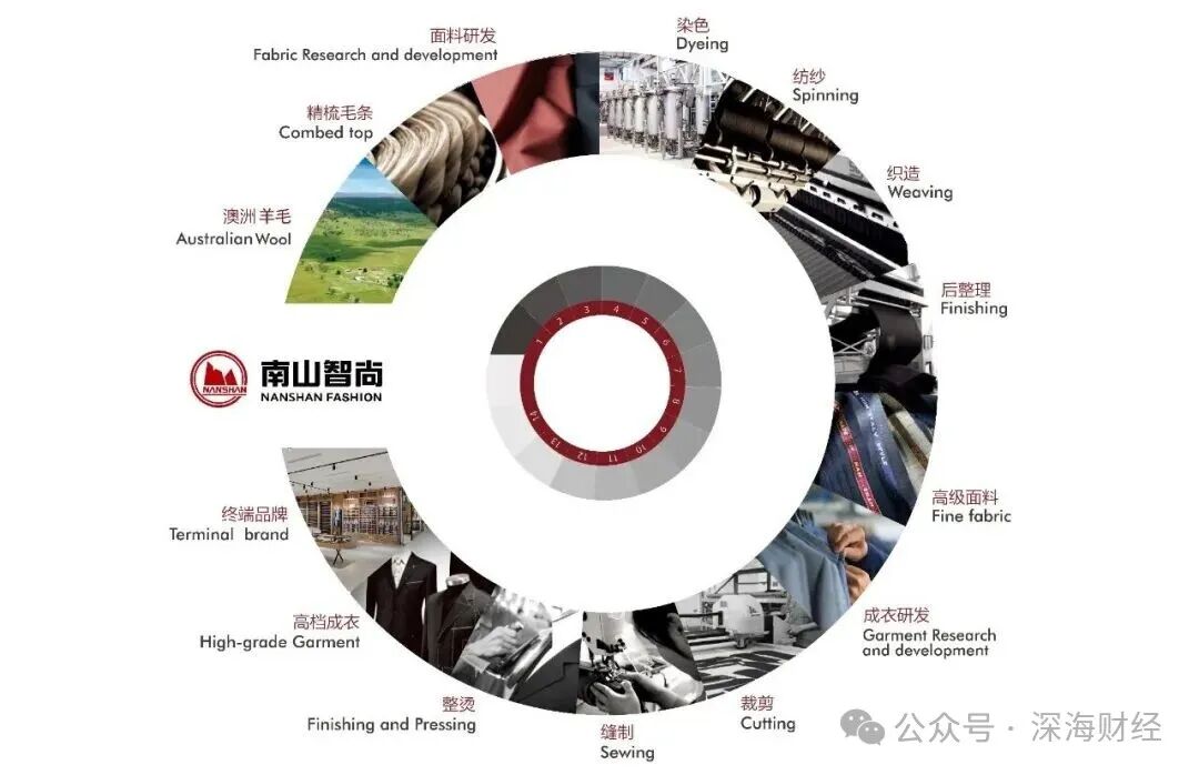作为全球为数不多的毛纺织服装产业链一体化公司,南山智尚拥有从羊毛到成衣完整的毛纺织服饰产业链,涵盖了集面料研发、毛条加工、染色、纺纱、织造等于一体的精纺呢绒业务体系,以及集成衣研发、设计、制造、品牌运营于一体的服装业务体系,年产高档精纺呢绒1600万米、西服75万套。