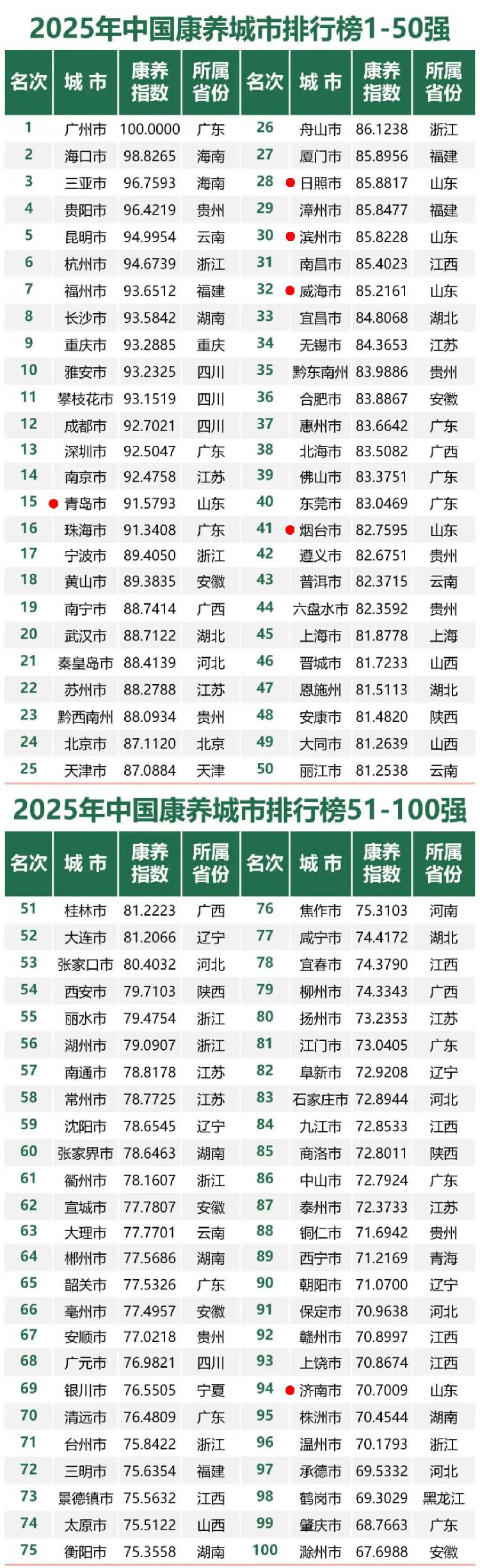 近日在河北举行的第四届中国康养大会,发布了“2025年中国康养城市排行榜百强”。榜单显示,广州市、海口市、三亚市、贵阳市、昆明市、杭州市、福州市、长沙市、重庆市、雅安市、攀枝花市、成都市、深圳市、南京市、青岛市成为最新的康养城市十五强城市。值得关注的是,在前15名中,青岛成为北方城市中的独苗。