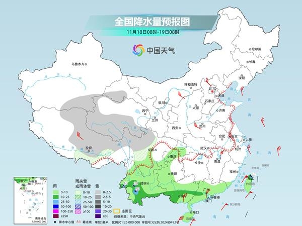 中央气象台预计,今天,新疆南疆盆地、西藏北部和东部、青海南部和西部、甘肃河西、川西高原北部等地部分地区有小雪或雨夹雪。西南地区东部和南部、华南大部、台湾岛等地部分地区有小到中雨,其中,云南西南部、台湾岛北部等地部分地区有大雨。