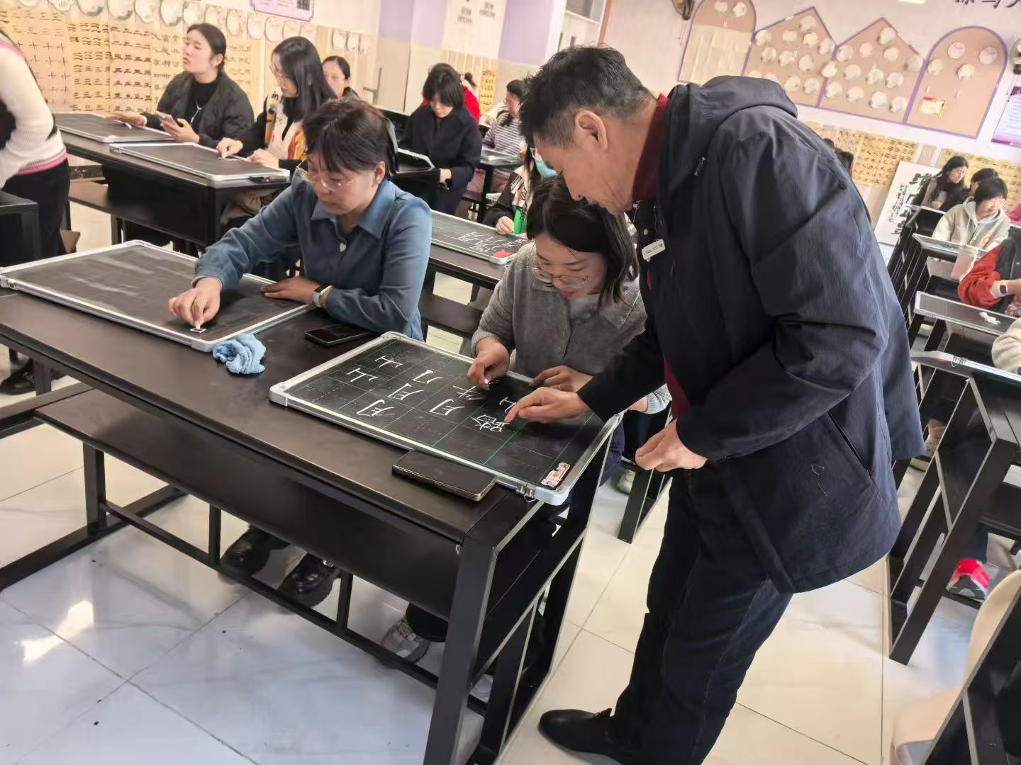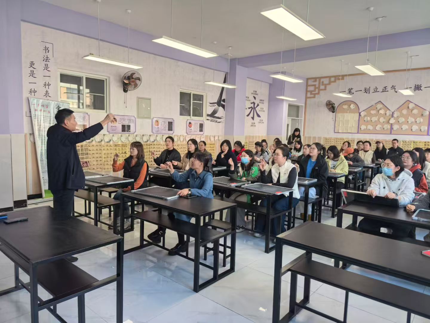 培训实操环节,教师们手持粉笔、借助书法练习板现场临摹练习,于老师则穿梭于课桌间,针对每位教师的书写细节逐一指导——小到笔画的轻重变化,大到字体的重心把控,都给出了精准的调整建议。当看到教师们在练习中遇到的共性问题,于老师还会集中演示、拆解要领,让大家在互动交流中快速掌握书写技巧,现场氛围专注而热烈。