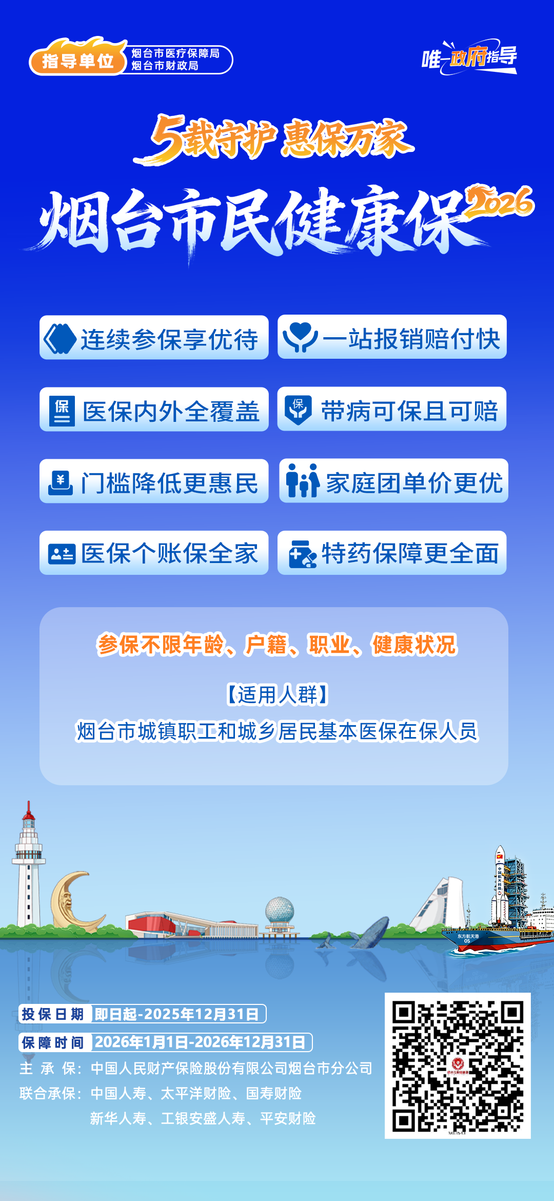 “烟台市民健康保”是烟台唯一一款政府指导的普惠型补充医疗保险,由烟台市医保局、财政局联合指导,是多层次医疗保障体系的重要内容,对减轻群众医疗费用负担、防止因病致贫返贫、满足市民多样化医疗保障需求具有重要意义。2026年度“烟台市民健康保”投保时间为2025年11月18日至12月31日,广大市民朋友可通过微信搜索“烟台市民健康保”或通过烟台市医疗保障局服务号及身边有销售资质的业务员投保,并支持使用医保个人账户余额为自己及家人进行缴费,更多问题可拨打400-182-6688客服进行咨询。