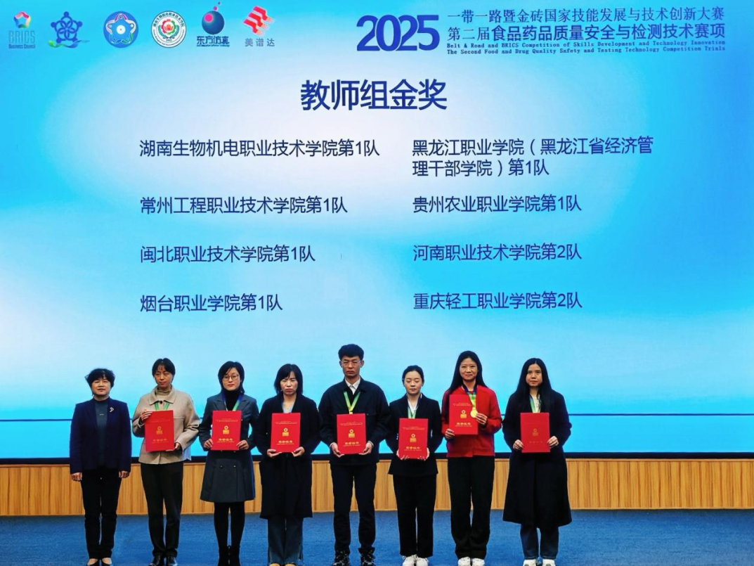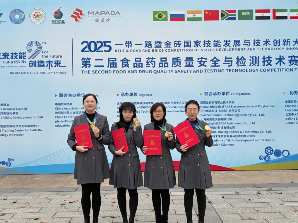 11月17日,第二届“一带一路暨金砖国家技能发展与技术创新大赛——食品药品质量安全与检测技术赛项(教师组)”全国总决赛落幕。烟台职业学院食品与生化工程系由遇艳萍、周雅雯、赵美姣、宋小含四位教师组成的参赛团队,凭借扎实的专业功底、创新的教学设计和出色的现场发挥,在全国多支参赛队伍中脱颖而出,斩获金奖。