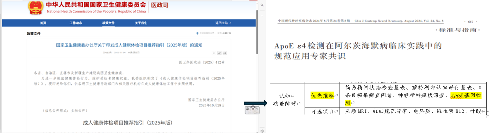 在过去,认知功能的筛查主要依赖各类量表,虽然具有一定价值,但存在主观性强、发现晚等局限。巴茂文教授团队基于大量的临床研究与数据分析,前瞻性地指出,将ApoE这一目前公认的散发性阿尔茨海默病最强风险基因因子纳入筛查体系,能够实现对高危人群的更早期、更客观的风险预警,为后续的干预与管理赢得宝贵的“时间窗”。正是这一具有前瞻性与实践性的专家共识,以其严谨的科学性与权威性,为国家卫健委提供了关键依据,最终推动ApoE检测从学术共识层面上升为国家级的健康管理推荐。