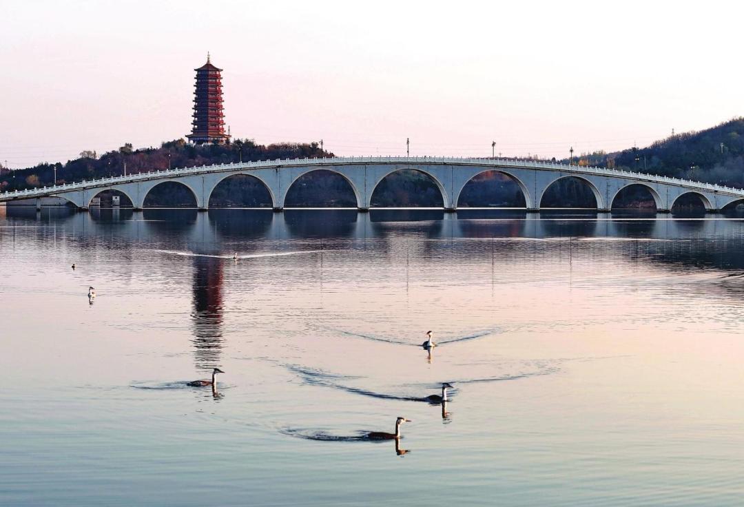 初冬时节的招远市金都龙王湖水利风景区,水面波光粼粼,䴙䴘等水鸟自在游弋,山、水、林、鸟交织成一幅灵动的初冬生态画卷。