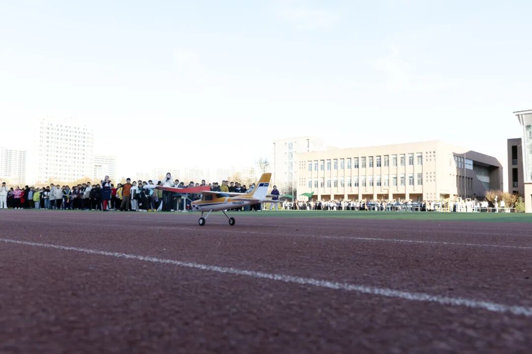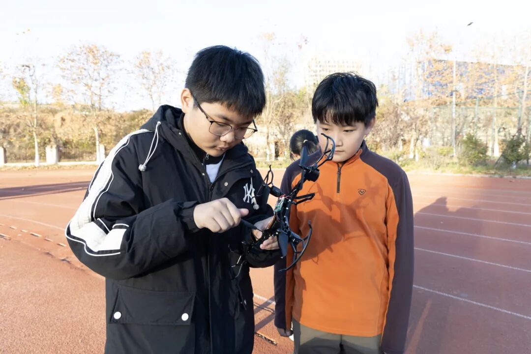 校园田径场变身“未来科技秀场”,天空中,无人机编队率先“炸场”——无人机悬挂彩旗,精准完成悬停、翻滚、协同编队等高难度动作,以蓝天为幕布,绘制出流动的科技画卷,现场惊叹声此起彼伏。紧接着,物理教研组的“水火箭发射”项目将气氛推向高潮:学生们亲手组装的水火箭在气压作用下呼啸升空,划出一道道白色轨迹。课堂上的物理公式在此刻“活”了过来,化作触手可及的科学奇迹,更印证了“实践是最好的老师”。