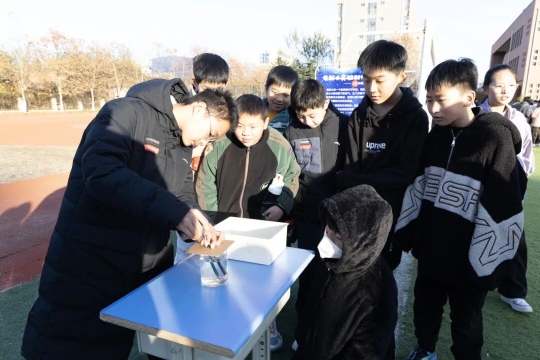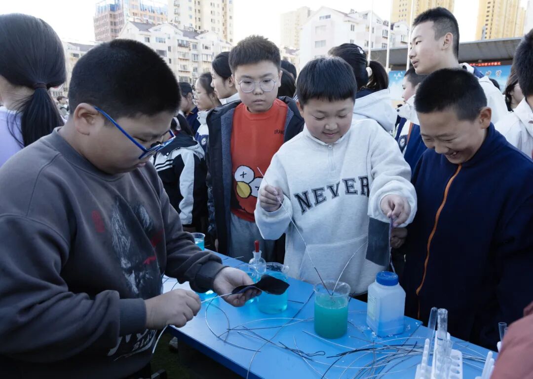 地面展区同样亮点纷呈。初三、初四年级学生自主设计的科技作品琳琅满目:声波光影仪的光影流转、直线电磁驱动小车的迅捷穿梭、空气炮的强劲冲击……每件作品均附详细设计说明与操作讲解,既展现了同学们天马行空的创意,更彰显了严谨的科学思维。8.3班学生曲瀚辰兴奋地向记者展示自己的电解水实验装置:“通过电源和电极分解水,能直观看到氢气和氧气的生成。做实验不仅让我搞懂了原理,更爱上了探索科学!”活动中,各班级有序观演、积极参与互动,学子们专注的眼神、跃跃欲试的身影,正是高新实验学子“善思笃行、求真探索”精神的生动注脚。