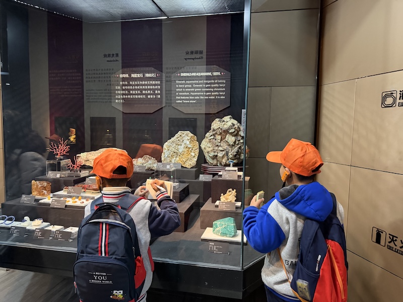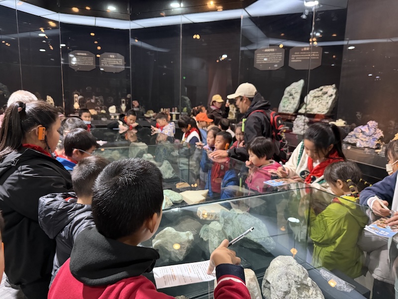 在矿物晶体展区,珍稀标本在灯光下熠熠生辉。研学教师手持实物教具讲解:“石英的断口呈贝壳状,云母能层层剥离,而赤铁矿的条痕总是樱红色的。”学生们通过触摸标本、观察条痕、比对硬度表,逐步掌握矿物鉴定的基本方法。