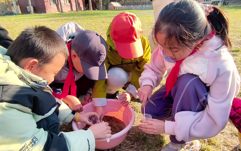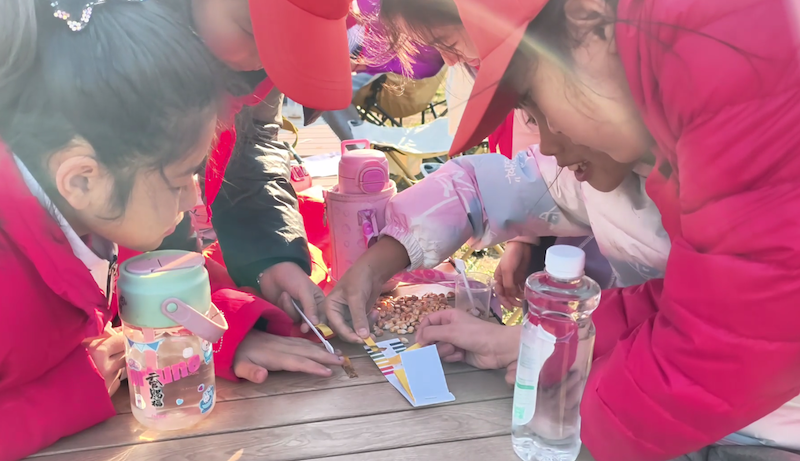午后,队伍转场至朱雀山森林公园,开启“地质勘探家”角色扮演。师生们分为六个研学小组,每组配备土壤及植物标本采样袋、PH检测试剂盒、矿物标本与放大镜。“注意观察土壤剖面的颜色分层,A层是腐殖质层,富含植物所需的有机质……”生态教师现场演示土壤采样规范,学生们蹲在松林间,小心翼翼地将分层土壤及植物标本装入贴有标签的采样袋,然后进行土壤PH值测试。