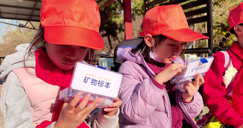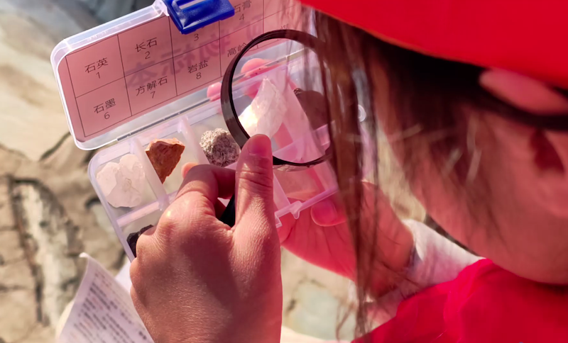 学生们对照“岩石标本”,在裸露的山体剖面中辨识着花岗岩、石灰岩与页岩的特征。手持地质锤的“小小勘探家”们在老师指导下,采集了具有代表性的岩石标本,用砂纸打磨后贴上包含“采集地点、岩性、形成年代”的标签,制作成“朱雀山地质小档案”。
