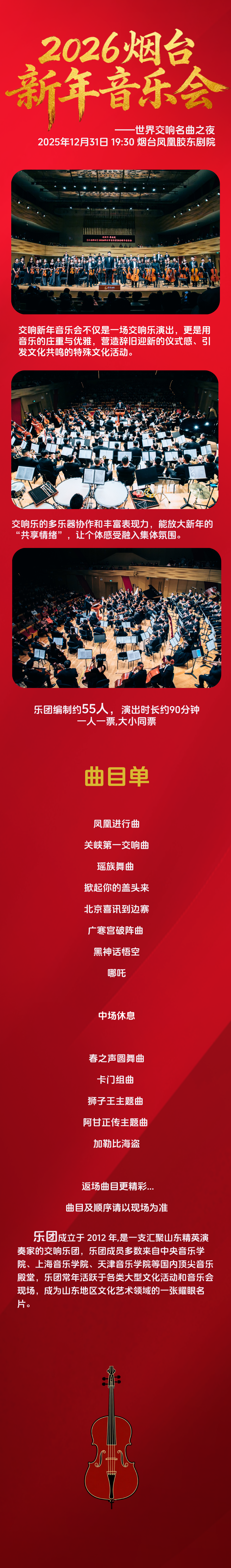 当2025年的尾声渐近,一场旨在营造辞旧迎新仪式感、引发文化共鸣的2026烟台新年音乐会——“世界交响名曲之夜”,将于2025年12月31日在烟台凤凰胶东剧院恢弘奏响!这不仅是一场交响盛宴,更是一份献给港城的新年厚礼。让我们在音乐的庄重与优雅中,开启2026年的华彩篇章!