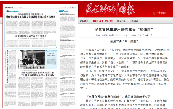近日,《民主与法制时报》刊发文章《基层立法“莱山实践”,民意直通车驶出法治建设“加速度”》,详细报道了莱山区司法局如何通过构建“线上+线下”立体化民意征集网络,以智慧化平台赋能立法全过程,将立法联系点直接建在群众身边,让普通百姓通过“扫码建言”等方式直接参与地方立法,形成从意见收集、分类办理到结果反馈的完整闭环,打造出立法与普法、执法深度融合的“莱山模式”,实现政府立法从“单向传递”到“双向互动”深刻转变的典型做法。