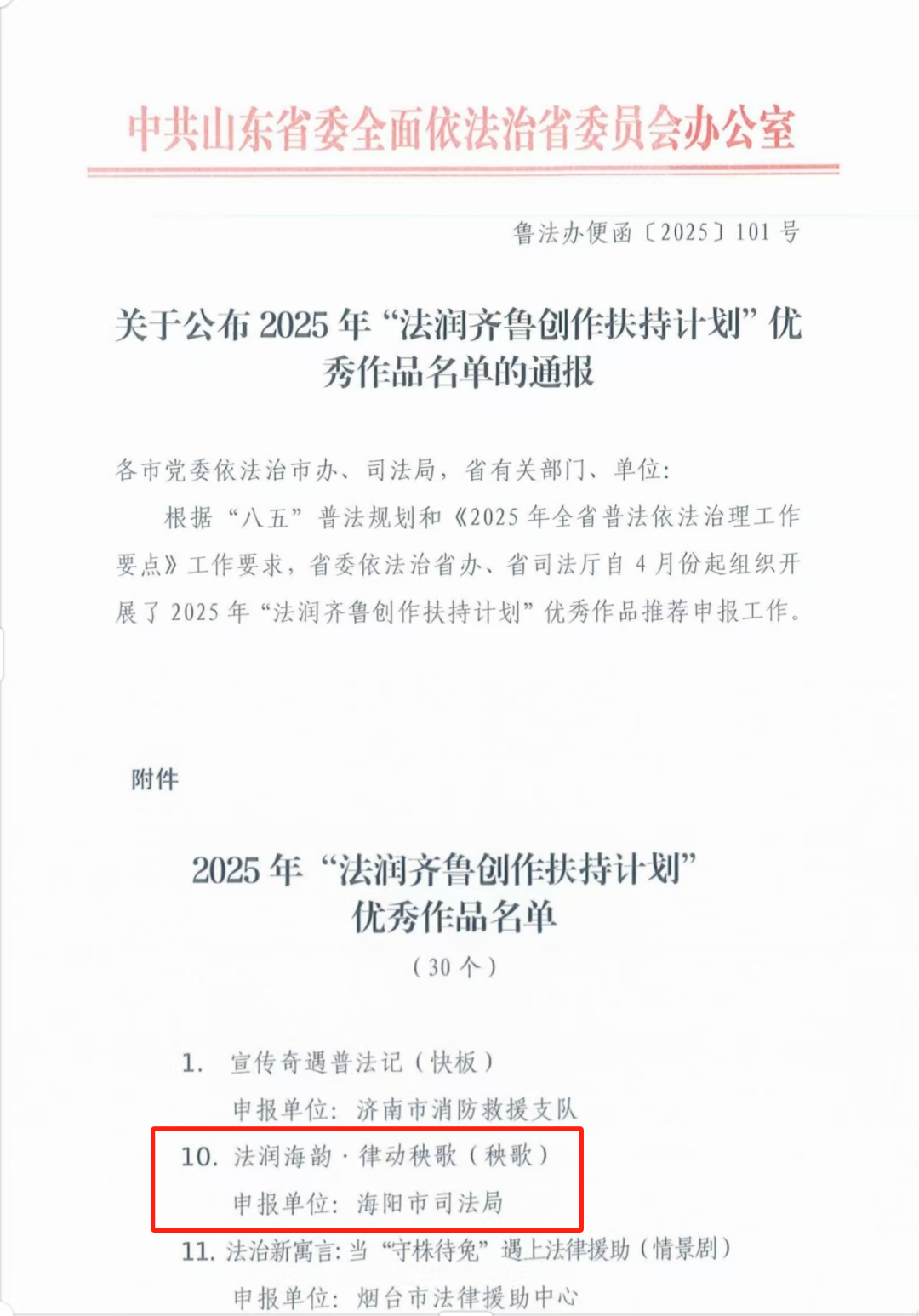 近日,中共山东省委全面依法治省委员会办公室、山东省司法厅联合公布了2025年“法润齐鲁创作扶持计划”优秀作品名单。由海阳市司法局选送、市京剧团精心编排的法治文艺节目《法润海韵·律动秧歌》作为烟台各区市唯一代表荣登榜单。