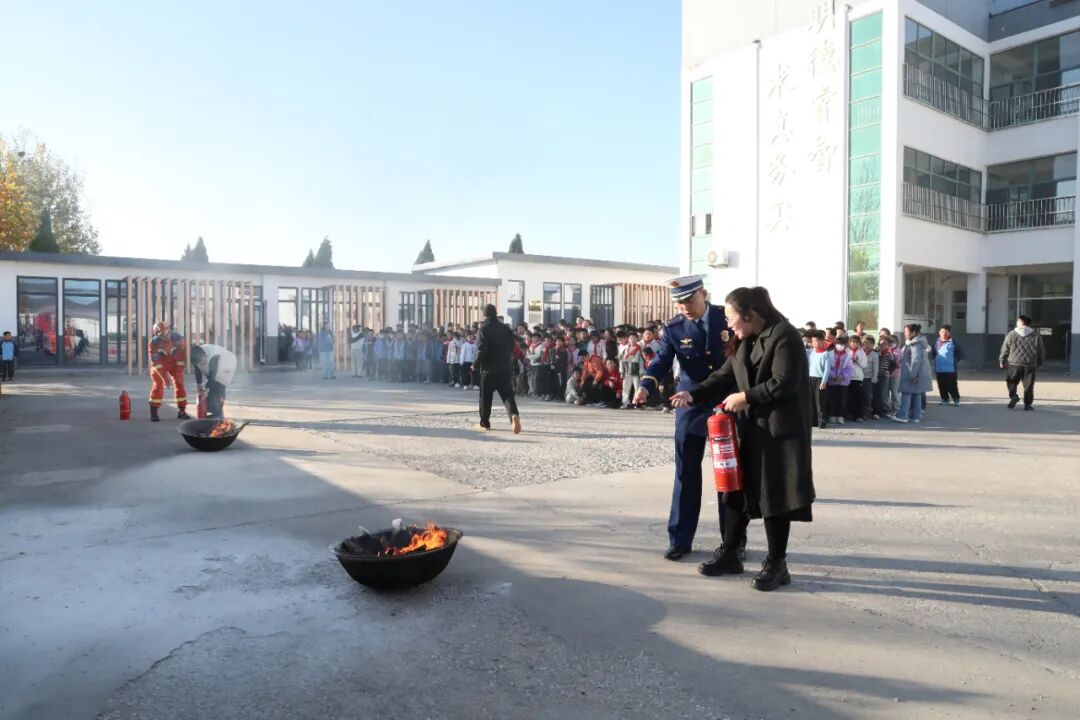 消防宣传人员重点演示了干粉灭火器“提、拔、握、压”的使用步骤,以及湿毛巾捂住口鼻、弯腰低姿逃生的正确方法。随后,在消防救援人员的指导下,师生代表依次上手操作灭火器,亲身体验“灭火”过程,通过沉浸式学习科学逃生技巧,切实将理论知识转化为实际能力。