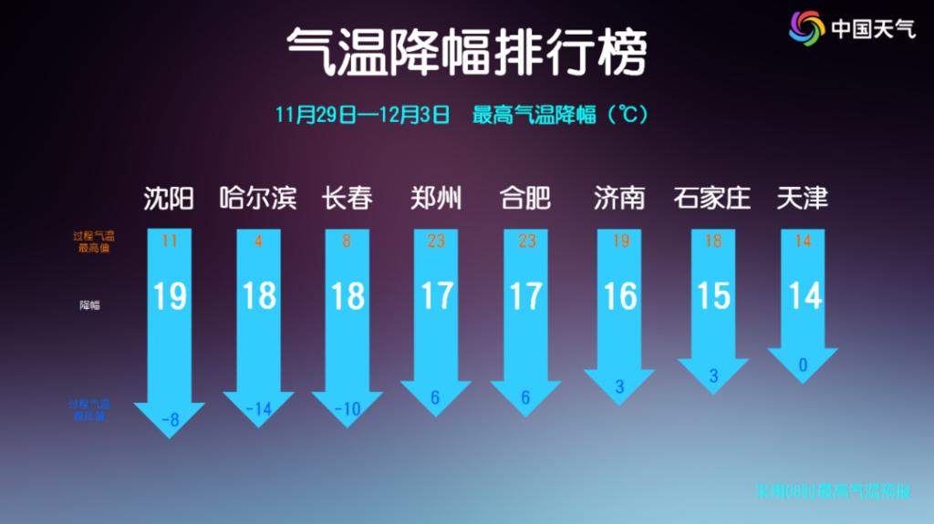 城市中像是哈尔滨、长春、沈阳,最高气温累计降幅都能达到接近20℃,哈尔滨、长春12月2日最高气温将是今冬首次降到-10℃以下,哈尔滨12月3日最低气温还将跌破-20℃。