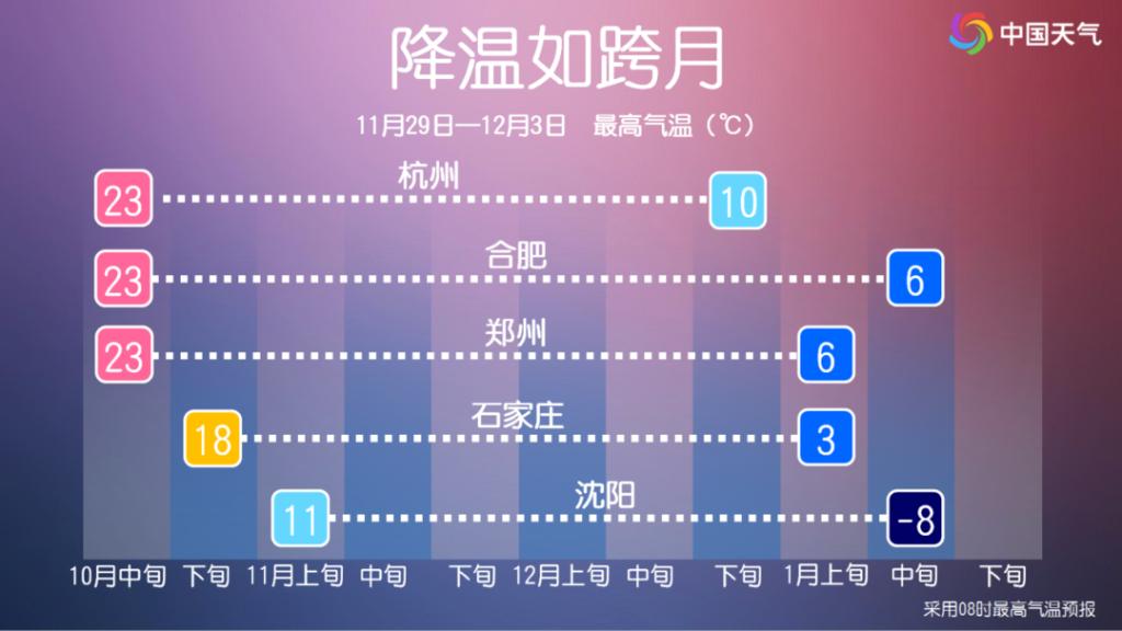 不少地方前两天还是20℃+,后面就跌至个位数的气温。像是郑州今天最高气温23℃,到12月2日只有5、6℃左右。
